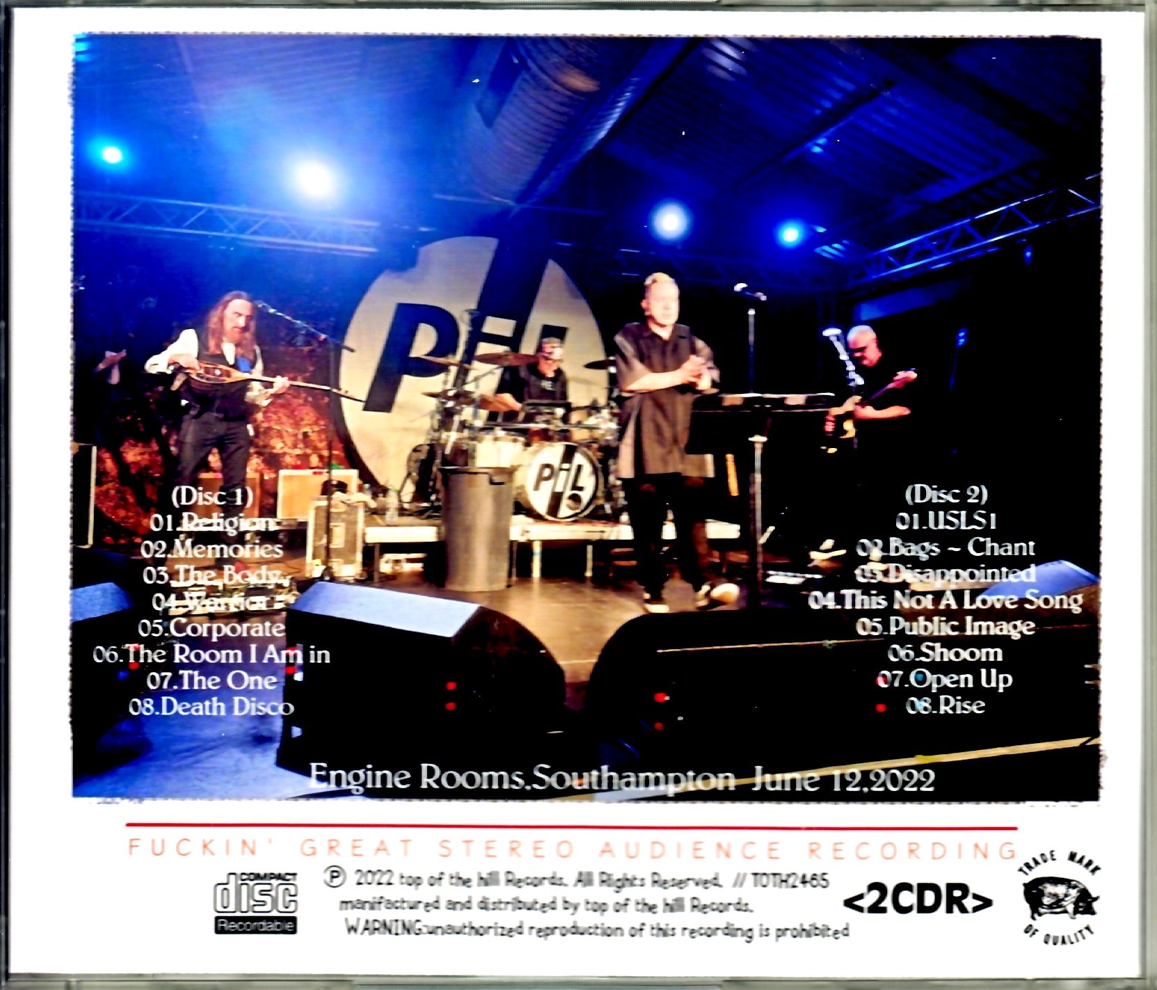 The latest sound source is a complete recording of a live performance held in Southampton from the latest UK tour that started in June with a high-quality stereo audience recording! The latest UK tour that started in June is the first tour in four years since the tour in 2018 to commemorate the 40th anniversary of their debut. The latest sound source is a complete recording of a live performance held at Engine Rooms, a multi-functional entertainment space in Southampton with a capacity of about 800 people, with a stereo audience recording! It is recorded directly from the master with digital PCM recording, and although there are some parts where the low range is slightly boosted, the vocals are very clear and large, the range is wide, and you can enjoy each part with a well-balanced clear high-quality sound! Starting with early numbers such as "Religion" and "Memories", the set list mixed old and new songs, including "Corporate" and "The One" from the 2019 release "What The World Needs Now...", and an arrangement that connected "Bags" and "Chant". John's powerful vocals can be heard, and P.I.L.'s latest rare club gig with the ironclad lineup of Lou Edmonds on guitar, Scott Firth on bass, and Bruce Smith on drums can be enjoyed with outstanding high sound quality! Engine Rooms,Southampton June 12,2022 (Disc 1) 01.Religion 02.Memories 03.The Body 04.Warrior 05.Corporate 06.The Room I Am in 07.The One 08.Death Disco (Disc 2) 01.USLS1 02.Bags ~ Chant 03.Disappointed 04.This Not A Love Song 05.Pub lic Image 06.Shoom 07.Open Up 08.Rise