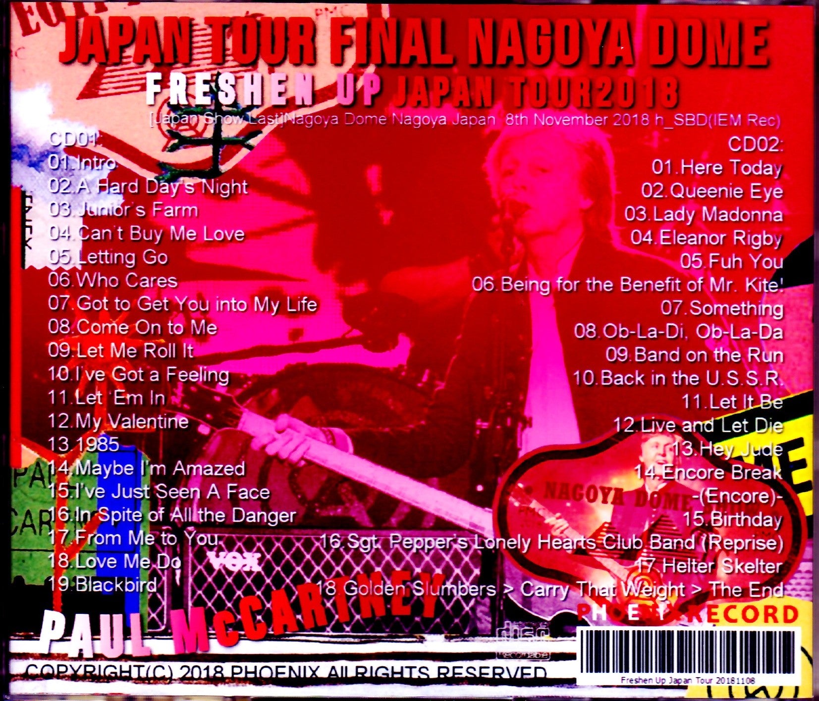 Paul McCartney 2018 Japan performance final day November 8th Nagoya Dome: Recorded live at Nagoya Japan with a hybrid soundboard. This will be the first concert in Nagoya of Paul McCartney's Japan tour, which started on October 31st. Audiences from all over Japan rushed to the venue for their first live show, and the audience was at its peak even before the live show, with all standing standing from the start of the live show, with Paul and the rest of the band excited.The venue was at its peak, with Paul speaking Nagoya dialect between songs. The venue was very excited with applause for the MC that he had incorporated into the set, and the set itself had several songs replaced, making it a parade of the best songs for Beatles fans of the past.Compared to other performances, Paul's MC was also longer. Since his wife Nancy's birthday is on November 20th, "Birthday" was performed as the first song of Encore, and Paul himself was in good condition and we could enjoy a powerful performance throughout, making it the best live performance suitable for the final day. I am. The Soundquality is produced with a hybrid SBD specification that uses an IEM source and an excellent AUD source to create a realistic and powerful sound, allowing you to enjoy stable high-quality sound. Freshen Up Japan Tour 2018 Final [Japan Show Last]Nagoya Dome:Nagoya Japan 8th November 2018 h_SBD(IEM) CD01: 01.Intro 02.A Hard Day's Night 03.Junior's Farm 04.Can't Buy Me Love 05.Letting Go 06.Who Cares 07.Got to Get You into My Life 08.Come On to Me 09.Let Me Roll It 10.I've Got a Feeling 11.Let 'Em In 12.My Valentine 13.1985 14.Maybe I'm Amazed 15.I've Just Seen A Face 16.In Spite of All the Danger 17.From Me to You 18.Love Me Do 19.Blackbird CD02: 01.Here Today 02.Queenie Eye 03.Lady Madonna 04.Eleanor Rigby 05.Fuh You 06.Being for the Benefit of Mr. Kite! 07.Something 08.Ob-La-Di, Ob-La-Da 09.Band on the Run 10.Back in the U.S.S.R. 11.Let It Be 12. Live and Let Die 13.Hey Jude 14.Encore Break -(Encore)- 15.Birthday 16.Sgt. Pepper's Lonely Hearts Club Band (Reprise) 17.Helter Skelter 18.Golden Slumbers > Carry That Weight > The End