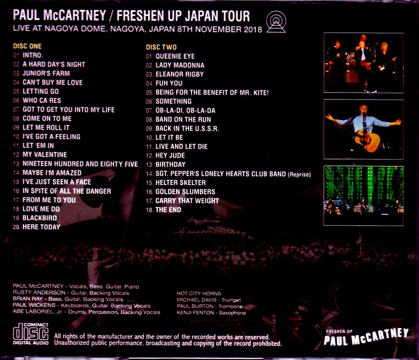 Until now, the 2018 Freshen Up Japan Tour had only been released for the Tokyo performance, but this time, the Nagoya performance, which was the final part of the tour, was finally released. That alone is enough to attract attention from enthusiasts, but since the sound source is confined, the sound source obtained at the time of its release is literally the best audience recording. That's no wonder, following the Ryogoku Kokugikan gig released at the same time this week, the same famous taper has done a great job once again. Not only was "RYOGOKU KOKUGIKAN 2018" a smaller venue than Budokan, but it was also recorded from the back of the box seats, which achieved amazing sound collection. Amazing sound quality. Considering the characteristics of the venue, I expected a dynamism similar to Tokyo Dome, but this time, the audience recording delivered by Mr. Taper had a surprisingly tight texture. In other words, the hall echoes that are typical of large venues are modest, and the sound image is intense. Thanks to this, I already have a feeling that the definitive version will be released even after the Nagoya performance, which had a modest release. Since it is such a special sound source, just like Ryogoku, Taper himself has released the sound source on the internet. Also, since the release is on two discs, the pre-performance footage is shorter than the version available there. However, I don't think anyone would feel that this is a disadvantage. Since it is such a super high-quality sound source, it is a sound source that can be released as is, but we have taken equalization to refine the recording which is still special. Since the original sound source has excellent characteristics, the sound quality has evolved into a solid and tight state, and the difference from the version heard on the internet is obvious. The sound quality of “Got To Get You Into My Life,” which was performed on the second day at the Tokyo Dome with horns filled with mania and excitement, really shines! You can still enjoy the power of the glaring horn corps and Paul Band's rock-solid performance. And the performance that was held to bring the Japan tour to a close was an outstanding performance. Everyone on stage from Paul on down was taking on the live performance with a lot of spirit and a lot of energy. For example, during the interlude of "My Valentine", he mumbles something (the sound is so good that you can even hear his gestures), and in the following "Nineteen Hundred and Eighty-Five", before he starts playing the intro, he exclaims, "Ha!" It's interesting to hear people shouting. Unlike "Yesterday", "Maybe I'm Amazed", which was revived in Nagoya, also has powerful singing from the beginning. Just by listening to these scenes, you can feel Paul's top condition. Along with Ryogoku, Paul's first performance in Nagoya was a hot topic during his visit to Japan. What's more, the hustle and hustle on the last day of the tour was extraordinary. In front of "Fuh You", he said "It's a new song!", but in front of "Band On The Run", he even said "It's the best!". What's even more moving is that during "Hey Jude," which concludes the main story, Paul recognizes the Nagoya version of the chorus card "NA" that started to become popular among Japanese fans last year, and repeats "Nana na goya!" over and over again. It's probably the scene that made me scream. The best part was that during the encore, they had originally planned to play "I Saw Her Standing There" just like they did on the second day at Tokyo Dome, but when they saw a fan's request card, they suddenly changed it to "Birthday". too. This moment was the perfect gift for the fans in Nagoya, as they were about to release their masterpiece, the Deluxe Edition of the White Album, the next day. While Paul's hustle is obvious, in the earlier song "Fuh You," he started singing too fast, and the song had a higher a cappella index than usual (because of this, the background music started to match Paul's song from the middle). On the contrary, the novelty of the injury is rather enjoyable. Anyway, it is an extremely high-quality sound source, and it is an amazing recording that has finally surpassed the second day of that famous sound source Austin. I would like everyone from beginners to enthusiasts to enjoy the powerful ultra recording, which is undoubtedly the highest quality at this stage. This very nice CD of the famous Nanana Goya performance that wrapped up this Japan tour beautifully, is definitely a candidate for the best! Live at Nagoya Dome, Nagoya, Japan 8th November 2018 ULTIMATE SOUND ★Mk4 used Arena B9 block. This is a high quality sound source provided by the recorder. Taper of the previous song "One On One At Budokan" (remastered memo) ★Although the sound quality is super high, if the separation of the bass line was improved, the sound quality would be even higher, so I made adjustments. Disc 1 (79:57) 1. Intro 2. A Hard Day's Night 3. Junior's Farm 4. Can't Buy Me Love 5. Letting Go 6. Who Cares 7. Got To Get You Into My Life 8. Come On to Me 9. Let Me Roll It 10. I've Got a Feeling 11. Let 'Em In 12. My Valentine 13. Nineteen Hundred and Eighty-Five 14. Maybe I'm Amazed 15. I've Just Seen A Face 16. In Spite of All the Danger 17. From Me to You 18. Love Me Do 19. Blackbird 20. Here Today Disc 2 (79:57) 1 . Queenie Eye 2. Lady Madonna 3. Eleanor Rigby 4. Fuh You 5. Being for the Benefit of Mr Kite! 6. Something 7. Ob-La-Di, Ob-La-Da 8. Band on the Run 9. Back in the USSR 10. Let It Be 11. Live and Let Die 12. Hey Jude 13. Birthday 14. Sgt Pepper's Lonely Hearts Club Band (Reprise) 15. Helter Skelter 16. Golden Slumbers 17. Carry That Weight 18. The End