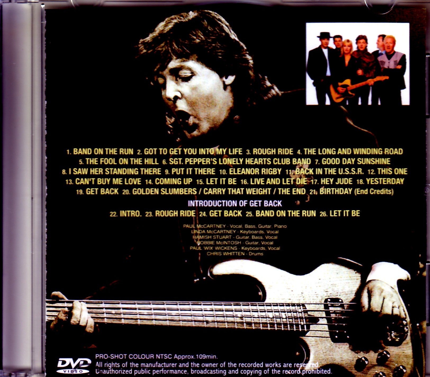 1. Band On The Run 2. Got To Get You Into My Life 3. Rough Ride 4. The Long And Winding Road 5. The Fool On The Hill 6. Sgt. Pepper's Lonely Hearts Club Band 7. Good Day Sunshine 8. I Saw Her Standing There 9. Put It There 10. Eleanor Rigby 11. Back In The U.S.S.R. 12. This One 13. Can't Buy Me Love 14. Coming Up 15. Let It Be 16. Live And Let Die 17. Hey Jude 18. Yesterday 19. Get Back 20. Golden Slumbers/Carry That Weight/The End 21. Birthday (End Credits) INTRODUCTION OF GET BACK Taken from the Japanese Original Laser Disc 22. Intro 23. Rough Ride 24. Get Back 25. Band On The Run 26. Let It Be PRO-SHOT COLOR NTSC Approx.109min.
