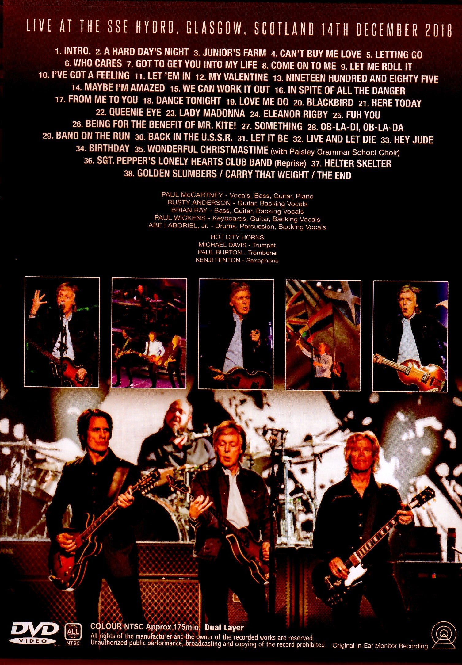 DVD(175:21) 1. Intro 2. A Hard Day's Night 3. Junior's Farm 4. Can't Buy Me Love 5. Letting Go 6. Who Cares 7. Got to Get You Into My Life 8. Come On to Me 9. Let Me Roll It 10. I've Got a Feeling 11. Let 'Em In 12. My Valentine 13. Nineteen Hundred and Eighty-Five 14. Maybe I'm Amazed 15. We Can Work It Out 16. In Spite of All the Danger 17. From Me to You 18. Dance Tonight 19. Love Me Do 20. Blackbird 21. Here Today 22. Queenie Eye 23. Lady Madonna 24. Eleanor Rigby 25. Fuh You 26. Being for the Benefit of Mr. Kite! 27. Something 28. Ob-La-Di, Ob-La-Da 29. Band on the Run 30. Back in the U.S.S.R. 31. Let It Be 32. Live and Let Die 33. Hey Jude 34. Birthday 35 . Wonderful Christmastime (with Paisley Grammar School Choir) 36. Sgt. Pepper's Lonely Hearts Club Band (Reprise) 37. Helter Skelter 38. Golden Slumbers / Carry That Weight / The End COLOR NTSC Approx.175min.