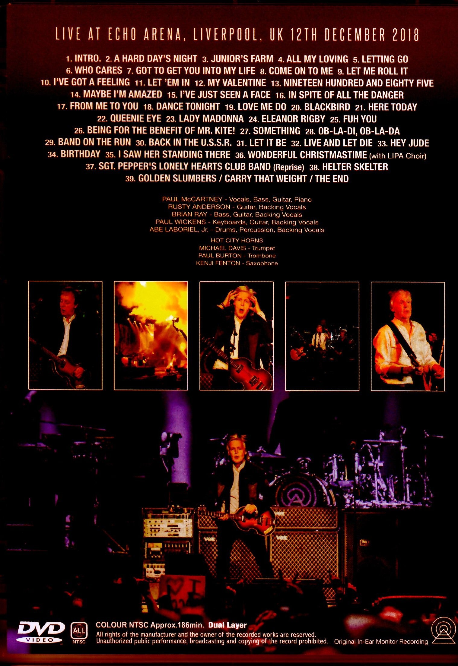 DVD(182:56) 1. Intro 2. A Hard Day's Night 3. Junior's Farm 4. All My Loving 5. Letting Go 6. Who Cares 7. Got to Get You Into My Life 8. Come On to Me 9. Let Me Roll It 10. I've Got a Feeling 11. Let 'Em In 12. My Valentine 13. Nineteen Hundred and Eighty-Five 14. Maybe I'm Amazed 15. I've Just Seen a Face 16. In Spite of All the Danger 17. From Me to You 18. Dance Tonight 19. Love Me Do 20. Blackbird 21. Here Today 22. Queenie Eye 23. Lady Madonna 24. Eleanor Rigby 25. Fuh You 26. Being for the Benefit of Mr. Kite! 27. Something 28. Ob-La-Di, Ob-La-Da 29. Band on the Run 30. Back in the U.S.S.R. 31. Let It Be 32. Live and Let Die 33. Hey Jude 34. Birthday 35. I Saw Her Standing There 36. Wonderful Christmastime (with LIPA Choir) 37. Sgt. Pepper's Lonely Hearts Club Band (Reprise) 38. Helter Skelter 39. Golden Slumbers / Carry That Weight / The End COLOUR NTSC Approx.186min.
