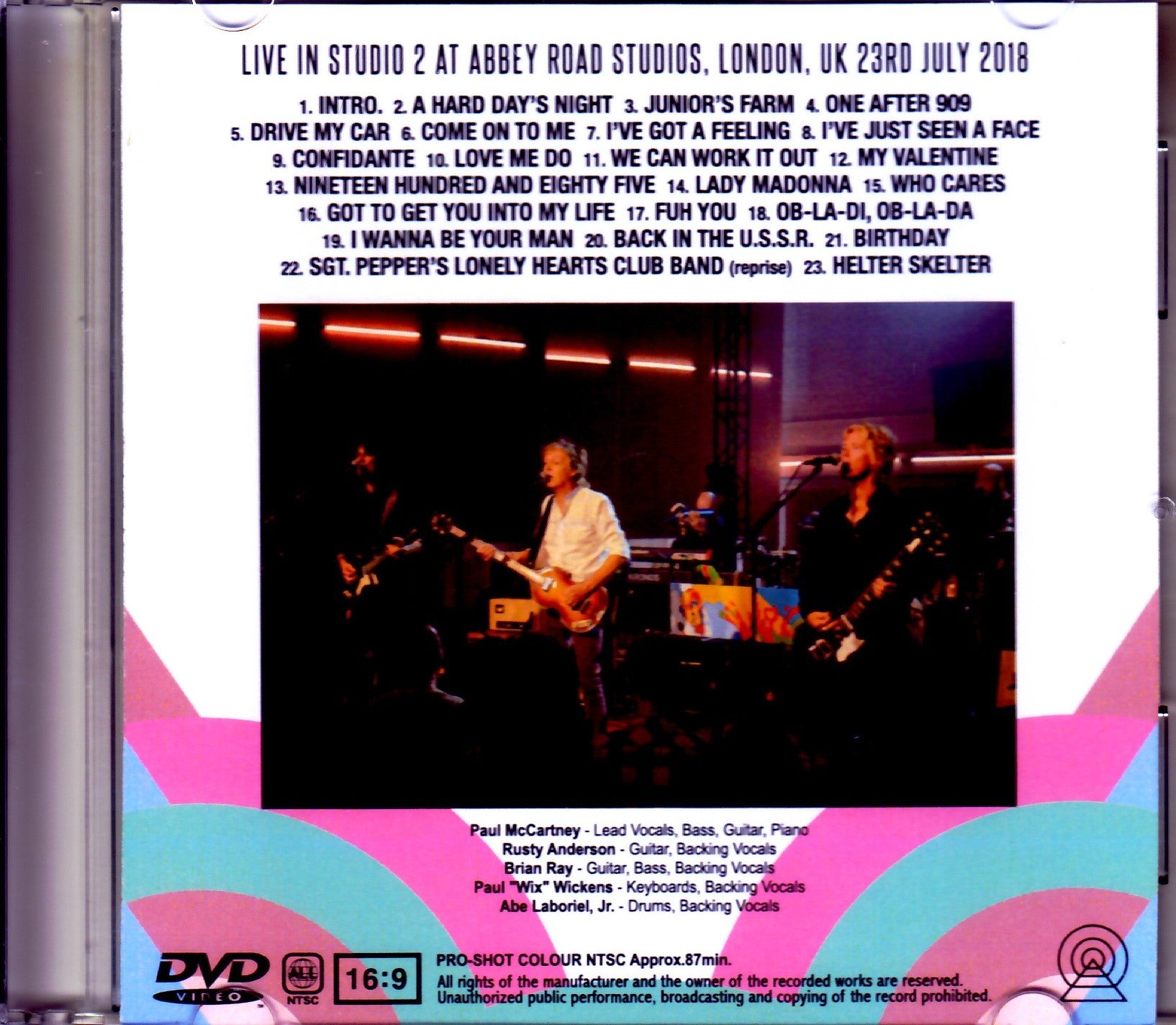 "UNDER THE STAIRCASE" gig at Abbey Road Studios. Naturally, they have produced many items, but when it comes to the audio of the video, perhaps due to a distribution dilemma, the texture is quite high-frequency, and depending on the item, it has been recorded with a harsh and hard sound quality that is almost "crunchy". It was moderate. On the other hand, the audio version that was originally distributed had a sound quality similar to that of an old mp3, which is also a problem. However, perhaps because the ease of distribution was well received, a later version with an increased number of songs immediately improved the sound quality, clearing up the stigma of the original version. In that case, the audio of the video becomes even more of a concern. In the first place, when the video spread, there were some that appeared slow or choppy, and there were even items that were released without resolving this issue. However, the "UNDER THE STAIRCASE" CD and dual DVD set released a few weeks ago solved this problem at once, and was well received as it was far more enjoyable than the previously released versions. . That's why I wonder if it would be possible to have the audio in an upper-level state. Naturally, such voices were heard. The three-CD and dual-DVD version mentioned earlier was certainly well-received, but I wonder if they could cover the video with the sound of an increased number of songs...I think that would make the live video even more enjoyable. There is no doubt about it. This release fulfills the wishes of enthusiasts around the world. The gig at Grand Central Station, which is Paul's latest live video along with the "UNDER THE STAIRCASE" gig, was held at the same time as the release of the album "EGYPT STATION", but this is from the release of the album. A gig from over a month ago. What's more, many celebrities including Johnny Depp were invited, and while both are special gigs, their natures are completely different. The Grand Central Station gig was like a condensed version of the main part of the "FRESHEN UP" tour, but this one has a strong secret gig feel. The beginning of the song is reminiscent of last year's Budokan. However, the unique taste is that the songs from "EGYPT STATION" are featured everywhere. When the album was released and the "FRESHEN UP" tour began, "Confidante", which had been played at Abbey Road Studio, was not included in the set list. This song is in the lineage of acoustic numbers such as "Friends To Go" and "On My Way To Work" released by Paul in recent years. Therefore, it is not featured in the main part of the tour in front of a large audience, and it is very attractive that you can see and hear the live version of the sound board recording and professional shot video here. Simple, unadorned songs like this are what enthusiasts want to hear live. Also, as symbolized by the scene in which Giles, who is George Martin's son and has now taken over his father's work on Beatles-related releases, is introduced to Paul and appears, the MC has a long MC between songs and talks about various anecdotes. , I think it's a gig-like scene that takes place in a more relaxed atmosphere than a normal live show. As a result, it is obvious that the gaps between songs have been edited in many places in the released video, but for this release, the momentary silence caused by cuts has been thoroughly eliminated. Of course, it's a small point, but those unnatural blank spaces that would bother enthusiasts are gone, making viewing more stress-free. It takes more time from recording to release than the gig at Central Station, and the editing sense for cuts is outstanding. For example, in “Junior’s Farm,” the scene in which drummer Ave grabs the microphone for the chorus is captured, and the editing sense stands out in a way that makes you groan when you watch it. In other words, the level of perfection as a live video is extremely high, and even if it were released as software as it is, it would be no different. The way the song titles appear when the performance begins is also very sophisticated, making it a first-class video work. And above all, the sound quality is completely different. Unlike the audio of the video where the high frequencies are noticeable, the low frequencies including Paul's bass line reverberate firmly. What's more, the degree of echo added to his voice has a texture that reminds me of the Budokan footage from three years ago. After all, it was a special gig held at Abbey Road Studios, which has had a deep connection since the Beatles era. Not only do we want to play back smooth, extremely clear video quality that is different from other items that have appeared so far, but we also want to play back the highest quality sound. Live in Studio 2 at Abbey Road Studios, London, UK 23rd July 2018 PRO-SHOT(UPGRADE) with the Best Audio Master!! (87:21) 1. Intro. 2. A Hard Day's Night 3. Juniors Farm 4. One After 909 5. Drive My Car 6. Come On To Me 7. I've Got A Feeling 8. I've Just Seen A Face 9. Confidante 10. Love Me Do 11. We Can Work It Out 12. My Valentine 13 . Nineteen Hundred And Eighty-Five 14. Lady Madonna 15. Who Cares 16. Got To Get You Into My Life 17. Fuh You 18. Ob-La-Di, Ob-La-Da 19. I Wanna Be Your Man 20. Back In The U.S.S.R 21. Birthday 22. Sgt. Pepper's Lonely Hearts Club Band (Reprise) 23. Helter Skelter PRO-SHOT COLOR NTSC Approx.87min.