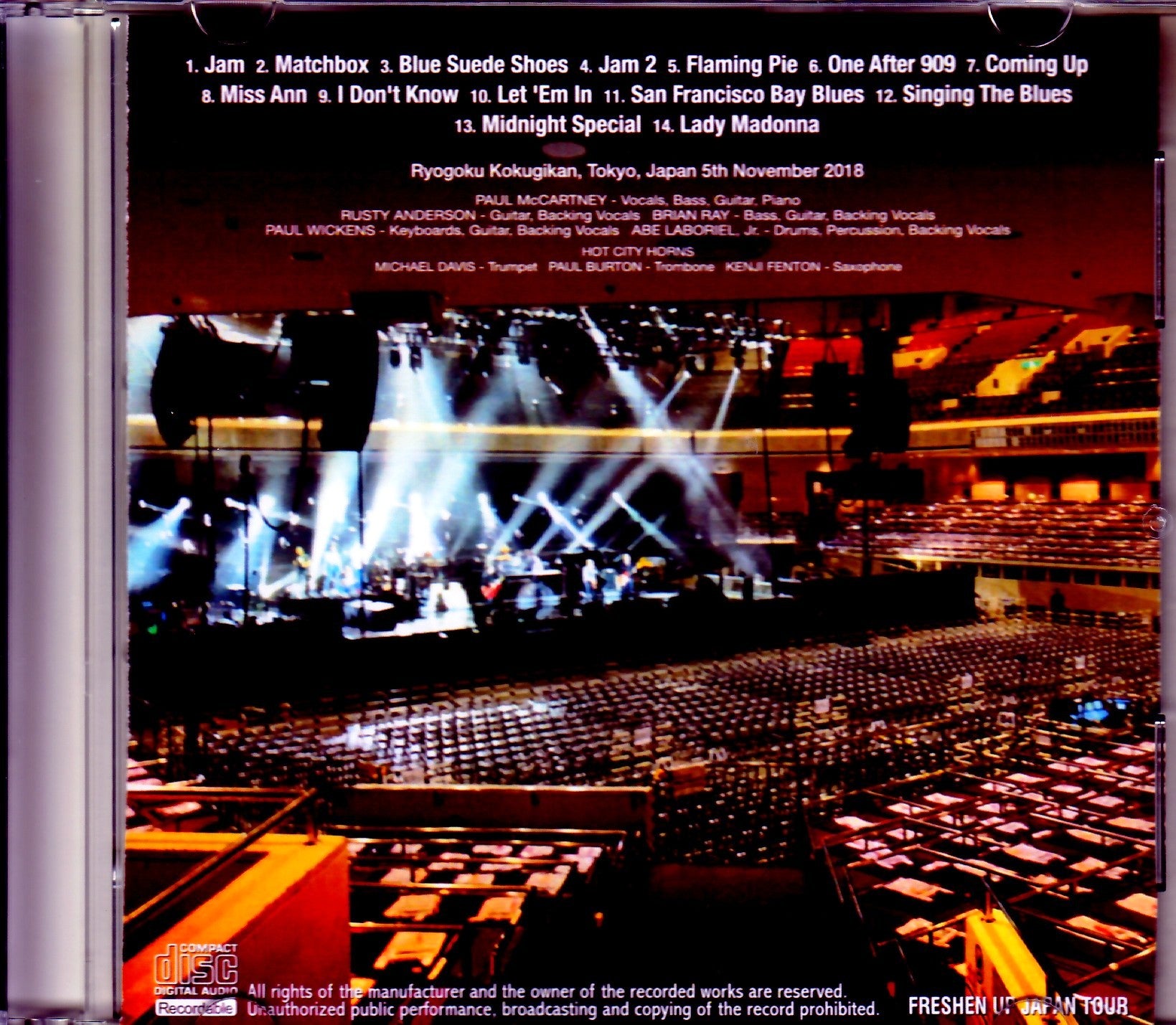 The latest sound check sound source that has just appeared on the internet has been quickly converted into a CD. This is a valuable sound source that gives us a glimpse of Ryogoku's rehearsal, which was a closed sound check similar to the October 30th Tokyo Dome rehearsal. This is also an Iamoni intercepted sound source, but according to the data from the taper that was released, it seems that the signal of one of the members of the horn squad was caught. Therefore, there is only one signal, and the whole thing contains the noise that is common in ear monitor interceptions. When you listen to this, you will be keenly aware of the outstanding recording technology and quality of the "CLOSED SOUNDCHECK AT TOKYO DOME 10.30.2018" released on October 30th. This is the so-called typical in-ear monitor sound quality. Having said that, the most valuable content is the sound check. In addition to “I Don’t Know” from the new album, which is not played in the actual performance, you can also hear “Flaming Pie”, which has completely turned into a sound check number. Furthermore, the horn corps is also participating in the rehearsal, so you can fully enjoy the power of “Coming Up” performed with their participation. And all of the performances are wonderful, so if even one of these was performed at the Ryōgoku concert...I would like to say that I am begging for something that is not there. At the beginning and end of the sound check, many old covers of familiar Paul favorites are performed, and you can enjoy a peaceful atmosphere and song selection that is completely different from the stage performance. “Singing The Blues” is not an acoustic arrangement like before, but is played in a vaudeville arrangement where Paul plays the ukulele and the band matches. The rough sound quality unique to earphone sound sources may be of mixed tastes, but it also has a stereo feel, and above all, the series of valuable numbers makes the sound check a must. Ryogoku Kokugikan, Tokyo, Japan 5th November 2018 (IEM) (48:21) 1. Jam 2. Matchbox 3. Blue Suede Shoes 4. Jam 2 5. Flaming Pie 6. One After 909 7. Coming Up 8. Miss Ann 9 I Don't Know 10. Let 'Em In 11. San Francisco Bay Blues 12. Singing The Blues 13. Midnight Special 14. Lady Madonna