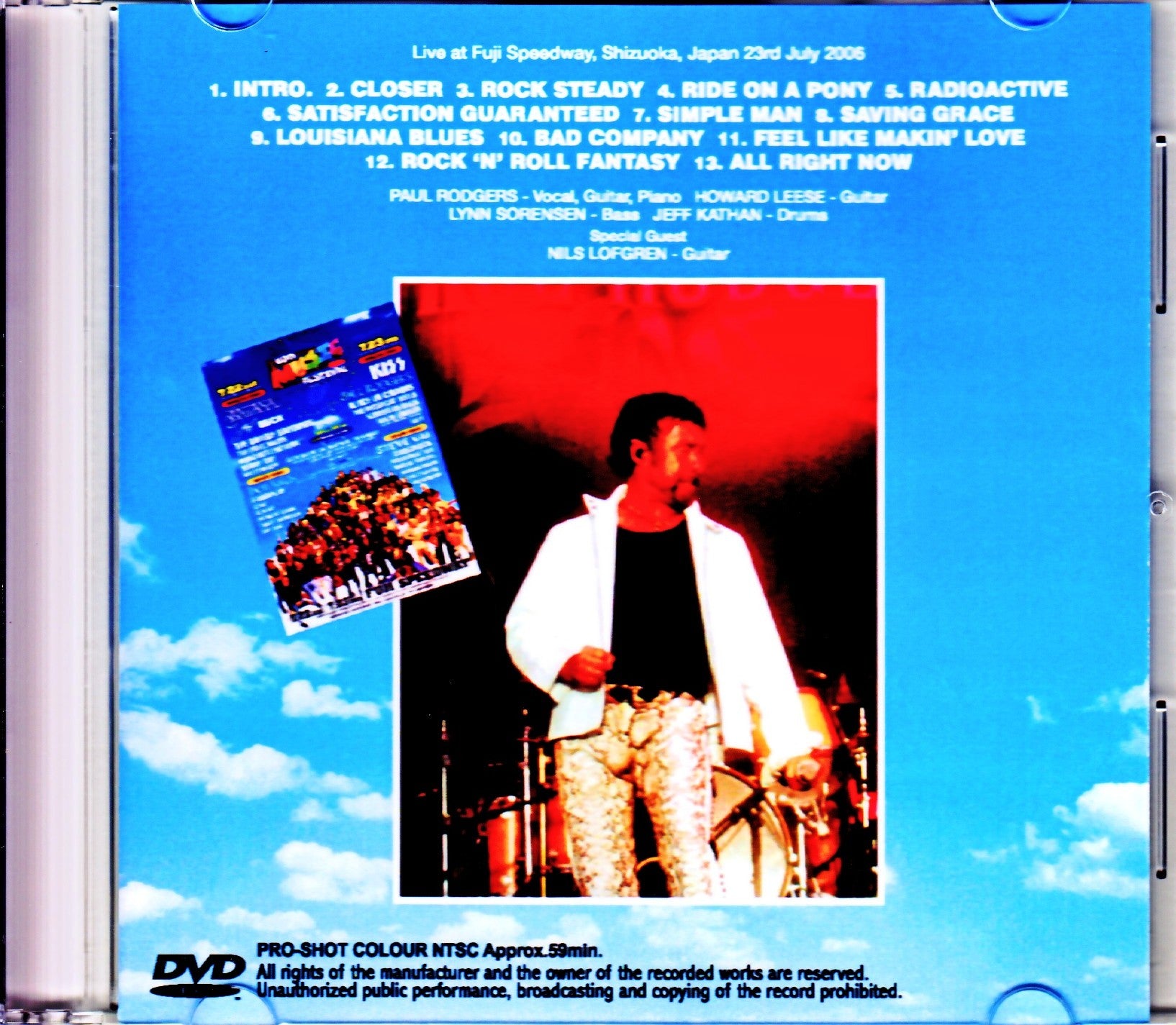 1. Intro 2. Closer 3. Rock Steady 4. Ride on a Pony 5. Radioactive 6. Satisfaction Guaranteed 7. Simple Man 8. Saving Grace 9. Louisiana Blues 10. Bad Company 11. Feel Like Makin' Love 12. Rock' n' Roll Fantasy 13. All Right Now Paul Rodgers - Vocal, Guitar, Piano Howard Leese - Guitar Lynn Sorensen - Bass Jeff Kathan - Drums Special Guest Nils Lofgren - Guitar ★Participated from Simple Man to the end PRO-SHOT COLOR NTSC Approx.59min .