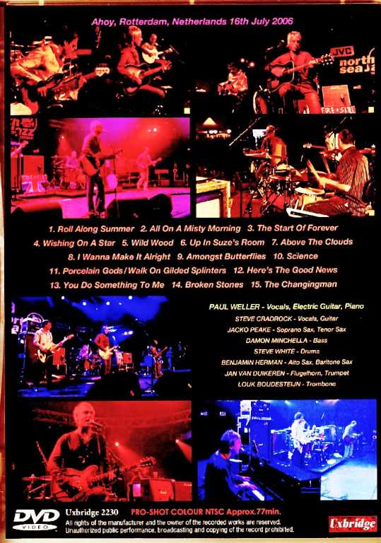 Ahoy, Rotterdam, Netherlands 16th July 2006 PRO-SHOT 1. Roll Along Summer 2. All On A Misty Morning 3. The Start Of Forever 4. Wishing On A Star 5. Wild Wood 6. Up In Suze's Room 7. Above The Clouds 8. I Wanna Make It Alright 9. Amongst Butterflies 10. Science 11. Porcelain Gods / Walk On Gilded Splinters 12. Here's The Good News 13. You Do Something To Me 14. Broken Stones 15. The Changingman Paul Weller - vocals, electric guitar, piano Steve Cradrock - vocals, guitar Jacko Peake - soprano sax, tenor sax Damon Minchella - bass Steve White - drums Benjamin Herman - alto sax, baritone sax Jan van Duikeren - flugelhorn, trumpet Louk Boudesteijn - trombone PRO-SHOT COLOUR NTSC Approx.77min.