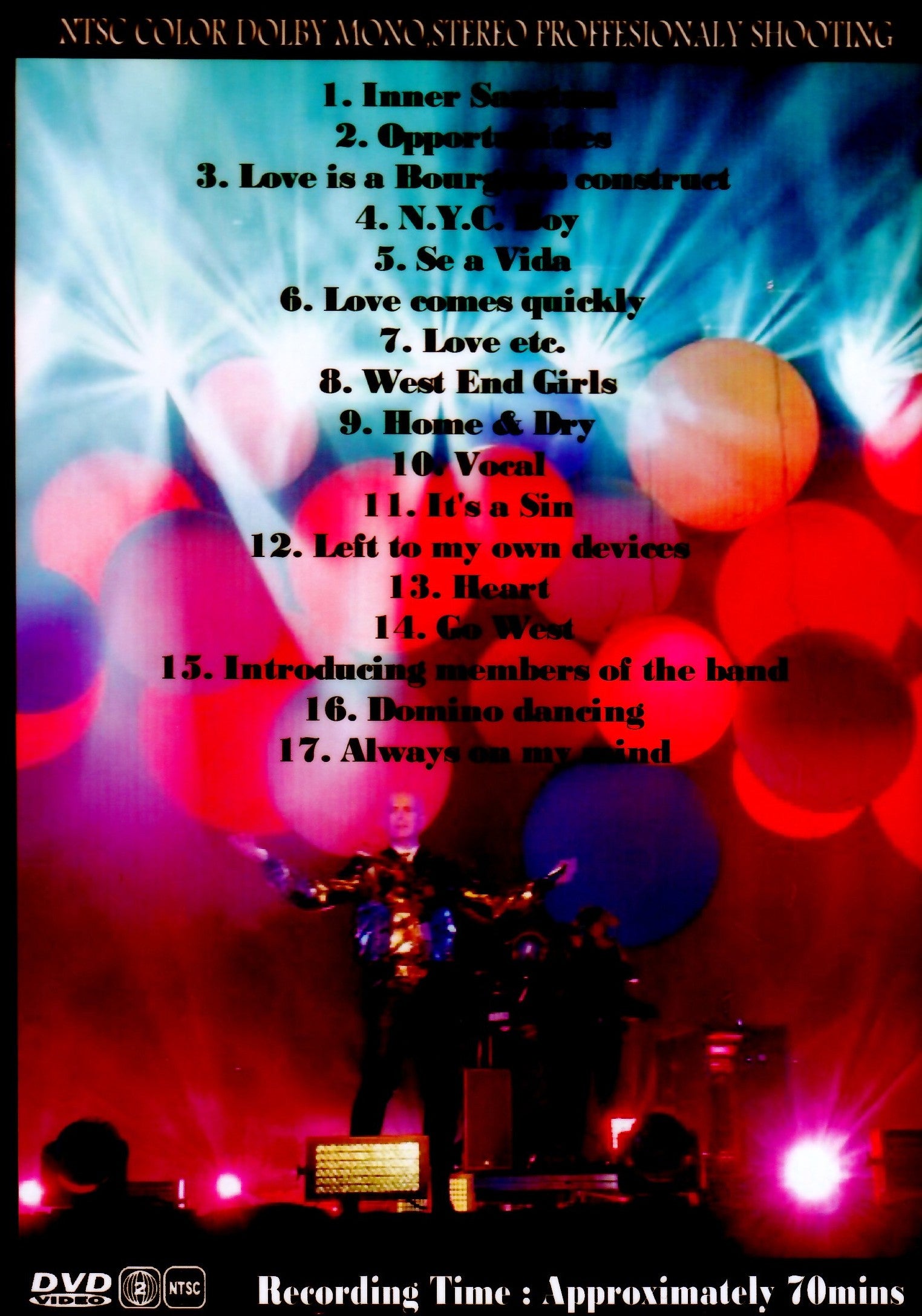DVD 1. Inner Sanctum 2. Opportunities 3. Love is a Bourgeois construct 4. N.Y.C. Boy 5. Se a Vida 6. Love comes quickly 7. Love etc. 8. West End Girls 9. Home & Dry 10. Vocal 11. It's a Sin 12. Left to my own devices 13. Heart 14. Go West 15. Introducing members of the band 16. Domino dancing 17. Always on my mind DVD Format: NTSC Source: Pro-Shot (Multi Camera) Video Quality: Rating: 8.5 Menus: Yes Chapter Selection: Every 5 Min. Widescreen: Yes HD: No Total Running Time: 74 Min.