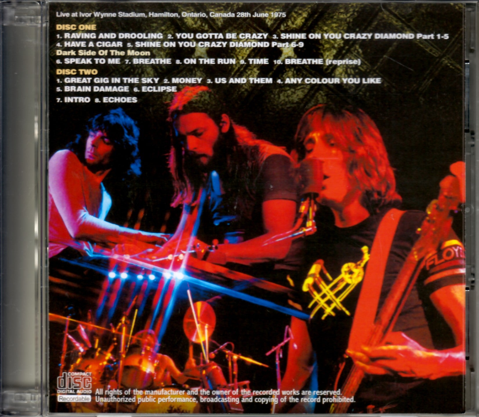 Disc 1(72:01) 1. Raving And Drooling 2. You Gotta Be Crazy 3. Shine On You Crazy Diamond Part 1-5 4. Have A Cigar 5. Shine On You Crazy Diamond Part 6-9 The Dark Side Of The Moon 6. Speak To Me 7. Breathe 8. On the Run 9. Time 10. Breathe (Reprise) Disc 2(63:00) 1. Great Gig In The Sky 2. Money 3. Us And Them 4. Any Color You Like 5. Brain Damage 6. Eclipse Encore 7. Soundcheck 8. Echoes