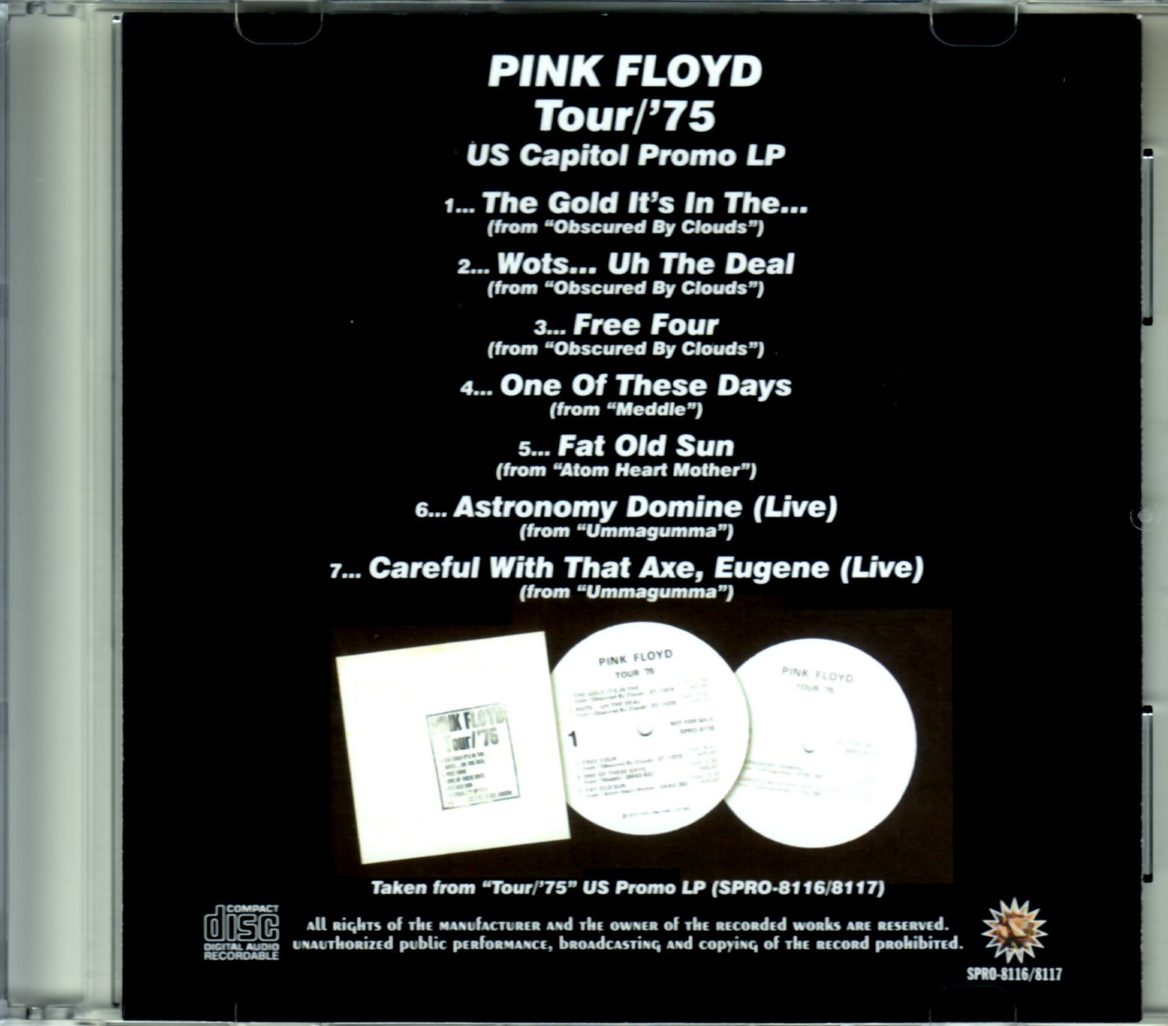 A mysterious extremely rare promo LP said to be produced by Capitol in the United States is recorded directly from the real thing and turned into a CD. This is probably the first time this item has been released on CD. It is rarely seen as a featured item at second-hand shops, but it is a gem (?) with a considerable premium price. This item, which is said to have been distributed to American radio stations in 1975 to promote a North American tour, is very mysterious. First of all, at first glance, it looks just like a vintage analog boot, with only a rough stamp of the artist's name, album title, and recorded songs on the front of the white jacket. The back side is pure white with nothing printed on it, making it even more suspicious. . . However, the label side of the record has a white promotional label design, and EMI credits are printed at the bottom of the label on Side 1, and the matrix number of the record is "SPRO-8116-F・1・" for Side 1. Side 2 is handwritten as "SPRO-8117-F・1", and both sides are engraved with "MASTERED BY CAPITOL" in typeface, which makes me feel at ease (?), "Is this a promo disc produced by Capitol?" ). The contents of the album are also incomprehensible, with a parade of song selections that will make you break out in a cold sweat, making it hard to believe that this was a promo for the 1975 tour. Judging from the title, one would tend to imagine "a precious live recording from 1975!", but the actual song selection and content is completely different from that, with tracks 1-5 being regular studio takes, and only 6-7 being live takes. However, this is a quote from the live track of the album "Umaguma". In particular, tracks 1 to 3 of the album ``Kumo no Kage'' have never been performed live at all, and the 5th song ``Fat De Yoyoro'' was also removed from the live set list by 1971, so it feels like it's too late. Of course, “Nuguezu”, “Heaven’s Rule”, and “Eugene” were not played on the 1975 tour. Anyway, both the appearance and the contents are full of mysteries, and there seems to be a lot of discussion on specialized sites about why such a promo disc was produced, whether it's real or fake, so why not check it out for yourself? . However, ``Heaven's Rule'' and ``Eugene'', which happened to be (probably) included here, are live versions from the album ``Umaguma'', which was also included in the rough mix version of ``Rarities'' released this week. It's true that this is a good timing item, and this may be due to some kind of connection, so why not take this opportunity to get it? A mysterious super rare promo LP is now available on a special disc! Taken from “Tour/'75” US Promo LP (SPRO-8116/8117)(41:08) 1. The Gold It's In The... 2. Wots... Uh The Deal 3. Free Four 4. One Of These Days 5. Fat Old Sun 6. Astronomy Domine (Live) 7. Careful With That Ax, Eugene (Live)