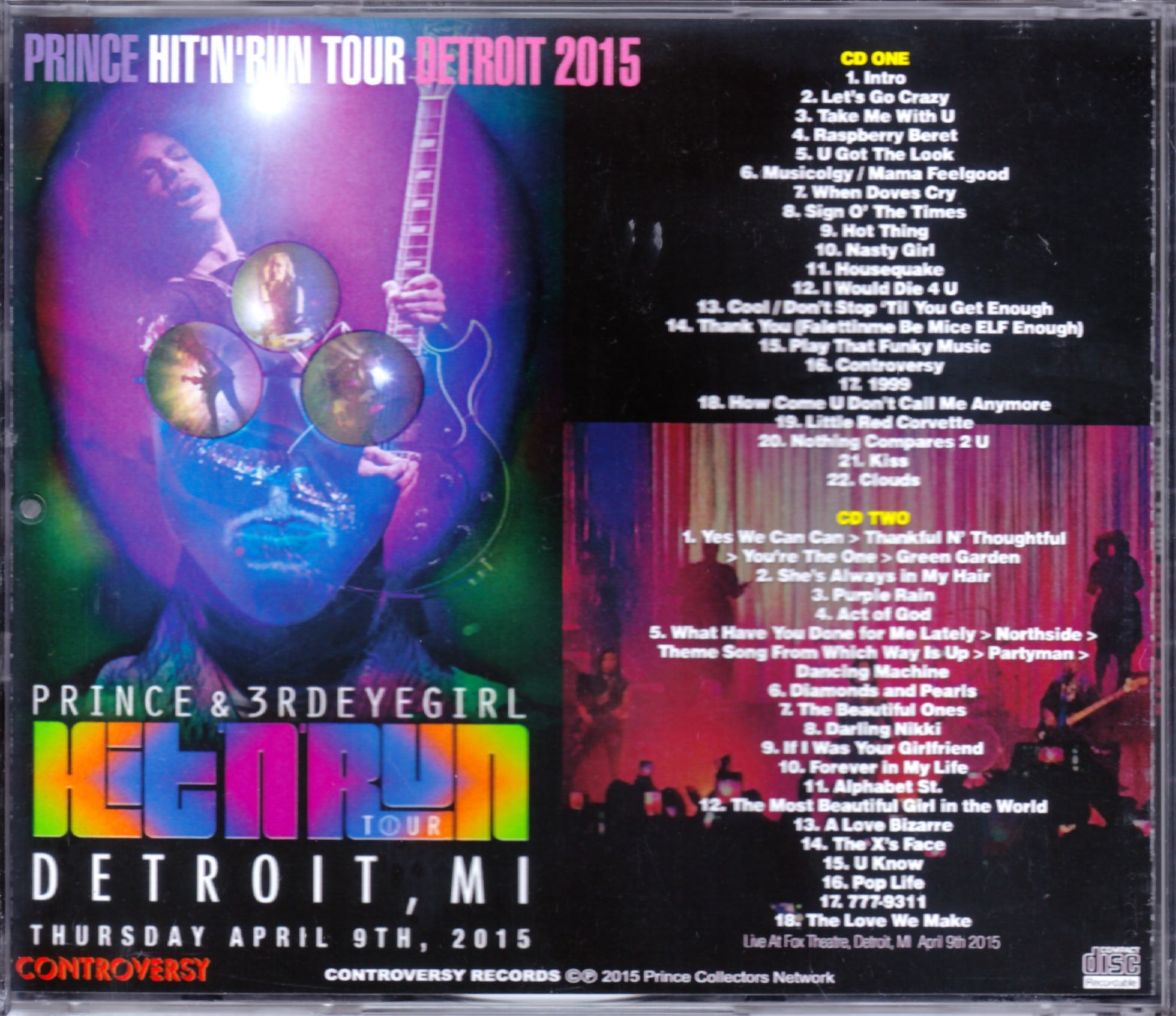 CD ONE : 1. Intro/2. Let's Go Crazy/3. Take Me With U/4. Raspberry Beret/5. U Got The Look/6. Musicolgy / Mama Feelgood/7. When Doves Cry/8. Sign O' The Times/9. Hot Thing/10. Nasty Girl/11. Housequake/12. I Would Die 4 U/13. Cool / Don't Stop 'Til You Get Enough/ 14. Thank You (Falettinme Be Mice ELF Enough) /15. Play That Funky Music/16. Controversy/17. 1999/18. How Come U Don't Call Me Anymore/19. Little Red Corvette/20. Nothing Compares 2 U/21. Kiss/22. Clouds CD TWO : 1. Yes We Can Can - Thankful N' Thoughtful - You're The One - Green Garden/2. She's Always in My Hair/3. Purple Rain/4. Act of God/5. What Have You Done for Me Lately - Northside - Theme Song From Which Way Is Up - Partyman - Dancing Machine/ 6. Diamonds and Pearls/7. The Beautiful Ones/8. Darling Nikki/9. If I Was Your Girlfriend/10. Forever in My Life/11. Alphabet St./12. The Most Beautiful Girl in the World/13. A Love Bizarre/14. The X's Face/15. U Know/16. Pop Life/17. 777-9311/18. The Love We Make [Live At Fox Theatre, Detroit, MI USA, April 9th 2015 : stereo soundboard recording]