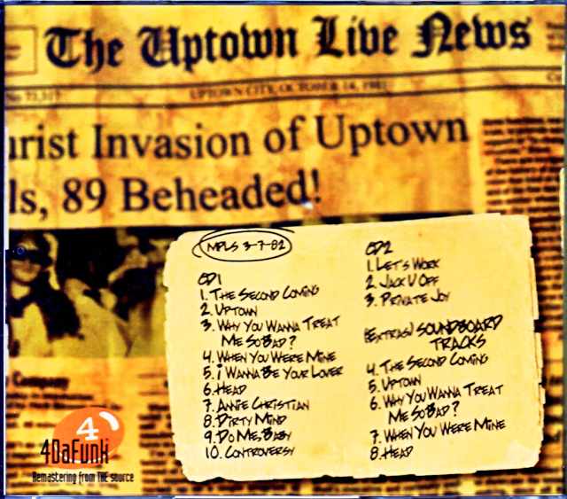 Controversy Tour Met Center, Bloomington Mar 7, 1982(Ex Soundboard) Disc 1 1.The Second Coming 2.Uptown 3.Why You Wanna Treat Me So Bad? 4.When You Were Mine 5.I Wanna Be Your Lover 6.Head 7.Annie Christian 8.Dirty Mind 9.Do Me, Baby 10.Controversy Disc 2 1.Let's Work 2.Jack U Off 3.Private Joy 4.The Second Coming 5.Uptown 6.Why You Wanna Treat Me So Bad? 7.When You Were Mine 8.Head