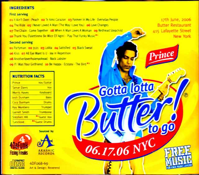 Butter Restaurant, New York June 17, 2006 Disc 1 1.It Ain't Over/Peach 2.Te Amo Corazon 3.Forever In My Life/Everyday People 4.The Ride 5.I Never Loved A Man(The Way That I Love You) 6.Love Changes 7.The Chain/Come Together 8.When A Man Loves A Woman 9.Redhead Stepchild 10.Thank You(Falettinme Be Mice Elf Agin)/Play That Funky Music Disc 2 1.Partyman 2.3121 3.Lolita 4.Satisfied 5.Black Sweat 6.Kiss 7.All I Want Is You/Joy In Repetition 8.Anotherloverholenyohead/Rock Lobster 9.If I Was Your Girlfriend 10.Be Happy/Ecstasy/The Bird