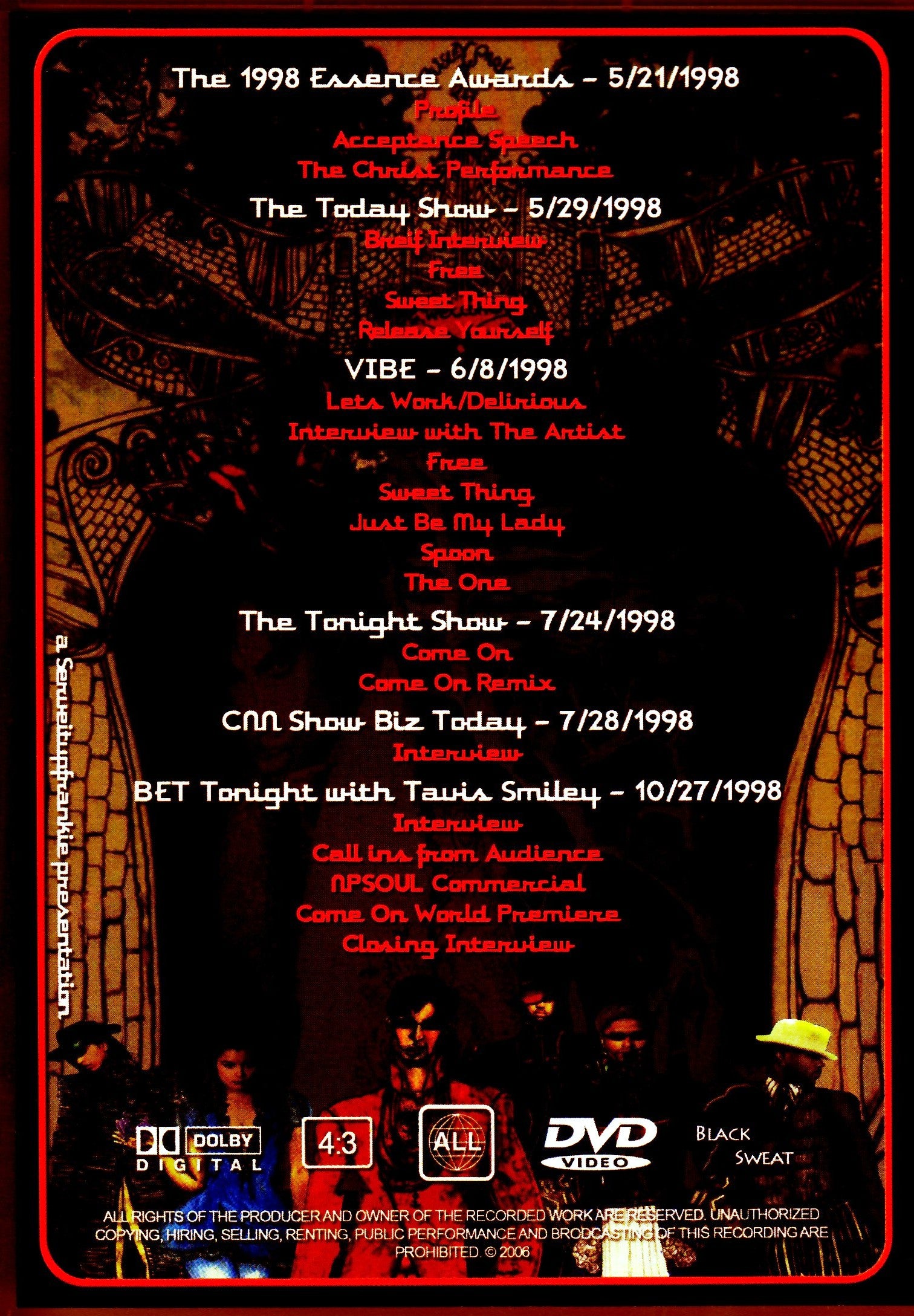 1998 Essence Awards : 10th April 1998 (Broadcast 21st May 1998) Intro / Award Acceptance / The Christ The Today Show : 29th May 1998 Intro / Free / Sweet Thing / Release Yourself Vibe : 8th June 1998 Let's Work / Delirious - Rock N' Roll Is Alive (outro) / Interview / Free / Sweet Thing / Just Be My Lady / Spoon / The One The Tonight Show w/ Jay Leno : 24th July 1998 Come On / Come On (Remix) CNN : 29th July 1998 Interview BET Tonight w / Tavis Smiley : 27th October 1998 Interview / Come On (promo video premiere) / Interview