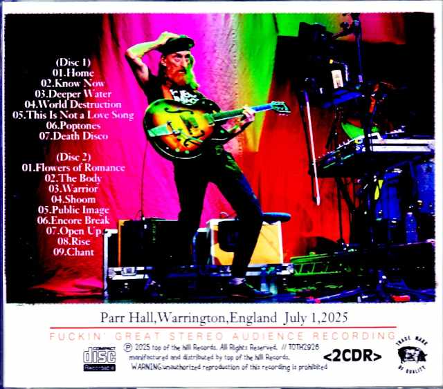 Parr Hall,Warrington,England July 1,2025 (Disc 1) 01.Home 02.Know Now 03.Deeper Water 04.World Destruction 05.This Is Not a Love Song 06.Poptones 07.Death Disco (Disc 2) 01.Flowers of Romance 02.The Body 03.Warrior 04.Shoom 05.Public Image 06.Encore Break 07.Open Up 08.Rise 09.Chant