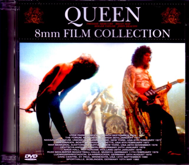 High quality compilation of the 8mm films/videos AMAZING QUALITY!!! Disc 1 Live at The Forum, Montreal, Canada 26th January 1977 A Day At The Races Tour 1977(Time: 12min 21sec) 1. Intro. 2. Tie Your Mother Down 3. Ogre Battle 4. Somebody To Love 5. Killer Queen 6. You're My Best Friend/Bring Back That Leroy Brown 7. You're My Best Friend 8. Bring Back That Leroy Brown 9. Brighton Rock 10. White Man/The Prophet's Song 11. Bohemian Rhapsody 12. Stone Cold Crazy 13. Liar 14. In The Lap Of The Gods... revisited 15. Now I'm Here Live at Nassau Coliseum, Uniondale, Long Island, New York, USA 6th February 1977 A Day At The Races Tour 1977(Time: 15min 34sec) 1. Intro. 2. Sweet Lady 3. Bohemian Rhapsody 4. Liar Live at The Garden, Boston, Massachusetts, USA 9th February 1977 A Day At The Races Tour 1977(Time: 6min 24sec) 1. Intro. 2. Tie Your Mother Down 3. White Queen 4. Somebody To Love 5. Killer Queen 6. The Millionaire Waltz 7. You're My Best Friend 8. Sweet Lady 9. Brighton Rock 10. '39 11. White Man 12. The Prophet's Song 13. Bohemian Rhapsody Live at War Memorial Auditorium, Buffalo, New York, USA 28th November 1978 Jazz Tour 1978(Time: 3min 06sec) 1. Intro. 2. Opening 3. We Will Rock You 4. Let Me Entertain You 5. Somebody To Love 6. If You Can't Beat Them 7. Death On Two Legs 8. '39/Love Of My Life 9. Fat Bottomed Girls 10. Drum Solo 11. Keep Yourself Alive 12. Bohemian Rhapsody 13. Tie Your Mother Down 14. Sheer Heart Attack 15. We Will Rock You 16. We Are The Champions 17. God Save The Queen Live at Ahoy Hall, Rotterdam, Holland 29th January 1979 Live Killers Tour 1979(Time: 20min 47sec) 1. Intro. 2. We Will Rock You 3. Somebody To Love 4. If You Can't Beat Them 5. Death On Two Legs 6. I'm In Love With My Car 7. You're My Best Friend 8. Brighton Rock 9. Don't Stop Me Now 10. Dreamer's Ball 11. Keep Yourself Alive 12. Bohemian Rhapsody 13. Tie Your Mother Down Live at Rudi Sedlmayer Basketball Halle, Munich, Germany 11th February 1979 Live Killers Tour 1979(Time: 25min 54sec) 1. Intro. 2. Opening 3. Let Me Entertain You 4. Now I'm Here 5. Bohemian Rhapsody 6. Sheer Heart Attack 7. We Will Rock You 8. We Are The Champions 9. God Save The Queen Disc 2 Live at Ludwigsparkstadion, Saarbrucken, Germany 18th August 1979 Live Killers Tour 1979(Time: 1min 06sec) 1. We Will Rock You Live at Civic Centre, St. Paul, Minnesota, USA 14th September 1980 The Game Tour 1980(Time: 25min 39sec) 1. Intro. 2. Let Me Entertain You 3. Play The Game 4. Mustapha 5. Death On Two Legs 6. Killer Queen 7. I'm In Love With My Car 8. Love Of My Life 9. Keep Yourself Alive 10. Guitar Solo 11. Drum Solo/Get Down Make Love 12. You're My Best Friend 13. Save Me 14. Now I'm Here 15. Guitar Solo 16. Crazy Little Thing Called Love 17. Bohemian Rhapsody 18. Tie Your Mother Down Live at Sporthalle, Boblingen, Germany 10th May 1982 Hot Space Tour 1982(Time: 9min 15sec) 1. Intro. 2. The Hero 3. Tie Your Mother Down 4. Action This Day 5. Somebody To Love 6. Love Of My Life 7. Liar 8. Get Down Make Love 9. Guitar Solo 10. Under Pressure 11. Staying Power 12. Bohemian Rhapsody/Dragon Attack 13. Crazy Little Thing Called Love 14. Sheer Heart Attack 15. We Will Rock You 16. We Are The Champions 17. God Save The Queen Bonus Tracks Hyde Park 1976 Outtakes Live at Hyde Park, London, UK 18th September 1976 (Time: 18min 27sec) 1. Intro. 2. Procession 3. Sweet Lady #1 4. Sweet Lady #2 5. Somebody To Love 6. Death On Two Legs 7. Tie Your Mother Down Live at Deutschlandhalle, Berlin, Germany 24th January 1979 (Time: 55sec) 1. It's Late Soundcheck at Ahoy Hall, Rotterdam, Holland 29th January 1979(Time: 1min 40sec) 1. Intro. 2. Guitar Check 3. Death On Two Legs(intro) 4. Death On Two Legs COLOUR NTSC Approx. 141min.