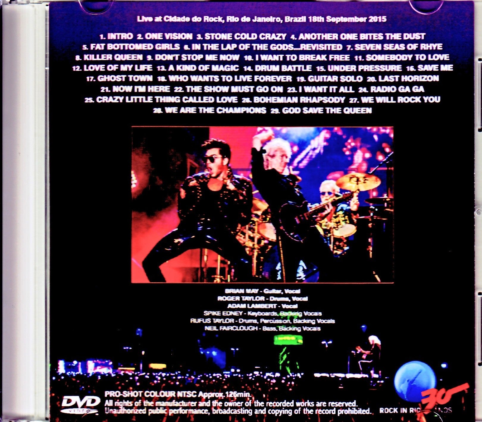 30 years have passed since Queen's 1985 Rock in Rio performance. This work is a professional shot video containing the live broadcast of “ROCK IN RIO VI” on September 18, 2015. The full show, which is over 2 hours long and digitally shot with superb image and sound quality, is recorded, and includes not only a huge circular screen but also a variety of costumes and the latest technology. You can watch everything in perfect quality. If the quality is perfect, the show is perfect too. This year, QUEEN + Adam Lambert held a European tour in January and February, but remained silent for about half a year. Then, in September, we held a total of 8 tours in South America. This work is the second performance. The setlist follows the European tour half a year ago, and includes "One Vision" and "Save Me," which they started playing in 2015. On the contrary, they even performed Adam's solo song "Ghost Town" (★). This song is the opening song of the album "THE ORIGINAL HIGH" released in June 2015, and this video is the second time QUEEN has performed it. Furthermore, even the audience is perfect. At this time, exactly one year after the impact of Summer Sonic in 2014, which marked the first visit of "QUEEN + Adam" to Japan, the enthusiasm of the outdoor festival shown in this work is a flashback to that day six years ago... No, it's a spectacular video with an even bigger crowd. After all, this “ROCK IN RIO VI” is also their first monumental concert in 30 years. Actually, this year marks ROCK IN RIO's 30th anniversary. QUEEN also appeared as a headliner at the “1st ROCK IN RIO” in 1985, and it remains in the official video. This is his first appearance since then. Currently, “ROCK IN RIO” is held in Spain, Portugal, etc., but this video is held in Rio, the same venue as the first one, and it is truly a night that has surpassed the time of 30 years. Rio has loved Queen as passionately as Japan since 1985, and that passion hasn't changed even after 30 years, and in this work, the huge crowd that filled the vast venue listened to the chorus. I'll give it to you. On the first day of the ``1st ROCK IN RIO'', the song ``I Want To Break Free'', which has an anecdote that caused a lot of boos for wearing a cross-dressing song, also included ``Rio'' in the lyrics many times, and the large crowd This is a very moving version that will become one. You can fully enjoy the luxurious rock show with the 2015 set, or you can pull out “LIVE IN RIO” while thinking about the weight of 30 years. From its quality to its historical significance, it is a masterpiece that is perfect in every way. If you want to watch "QUEEN + Adam Lambert" at this time, this is the one to watch first. Cidade do Rock, Rio de Janeiro, Brazil 18th September 2015 PRO-SHOT(2:06:04) 1. Intro 2. One Vision 3. Stone Cold Crazy 4. Another One Bites The Dust 5. Fat Bottomed Girls 6. In The Lap Of The Gods...Revisited 7. Seven Seas Of Rhye 8. Killer Queen 9. Don't Stop Me Now 10. I Want To Break Free 11. Somebody To Love 12. Love Of My Life 13. A Kind Of Magic 14. Drum Battle 15. Under Pressure 16. Save Me 17. Ghost Town★18. Who Wants To Live Forever 19. Guitar Solo 20. Last Horizon 21. Now I'm Here 22. The Show Must Go On 23. I Want It All 24. Radio Ga Ga 25. Crazy Little Thing Called Love 26. Bohemian Rhapsody 27. We Will Rock You 28. We Are The Champions 29. God Save The Queen PRO-SHOT COLOR NTSC Approx.126min.
