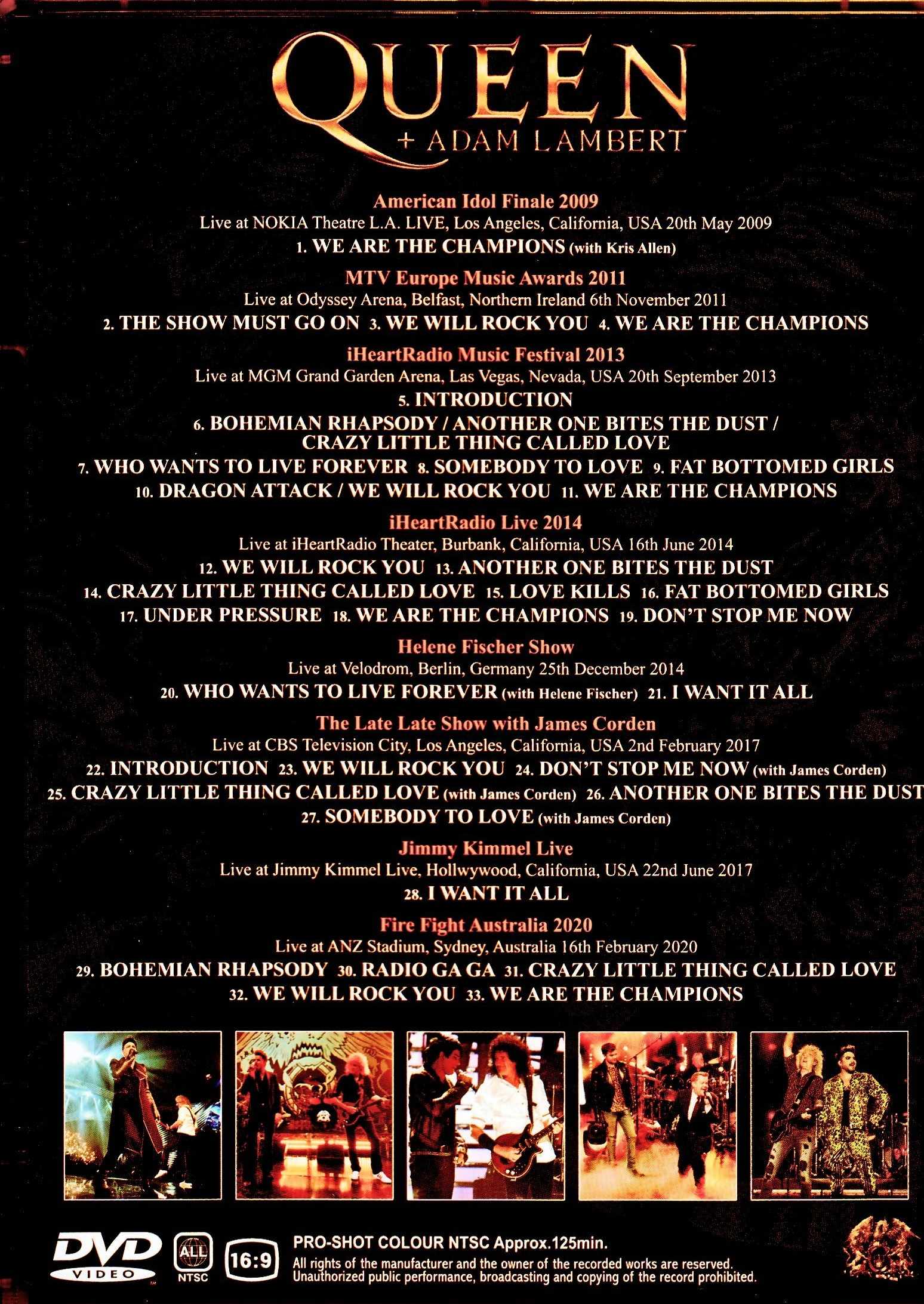 1. We Are The Champions (with Kris Allen) MTV Europe Music Awards 2011 Live at Odyssey Arena, Belfast, Northern Ireland 6th November 2011 2. The Show Must Go On 3. We Will Rock You 4. We Are The Champions iHeartRadio Music Festival 2013 Live at MGM Grand Garden Arena, Las Vegas, Nevada, USA 20th September 2013 5. Introduction 6. Bohemian Rhapsody / Another One Bites The Dust / Crazy Little Thing Called Love 7. Who Wants To Live Forever 8. Somebody To Love 9. Fat Bottomed Girls 10. Dragon Attack / We Will Rock You 11. We Are The Champions iHeartRadio Live 2014 Live at iHeartRadio Theater, Burbank, California, USA 16th June 2014 12. We Will Rock You 13. Another One Bites the Dust 14. Crazy Little Thing Called Love 15. Love Kills 16. Fat Bottomed Girls 17. Under Pressure 18. We Are the Champions 19. Don't Stop Me Now Helene Fischer Show Live at Velodrom, Berlin, Germany 25th December 2014 20. Who Wants to Live Forever (with Helene Fischer) 21. I Want It All The Late Late Show with James Corden Live at CBS Television City, Los Angeles, California, USA 2nd February 2017 22. Introduction 23. We Will Rock You 24. Don't Stop Me Now (with James Corden) 25. Crazy Little Thing Called Love (with James Corden) 26. Another One Bites the Dust 27. Somebody To Love (with James Corden) Jimmy Kimmel Live Live at Jimmy Kimmel Live, Hollwywood, California, USA 22nd June 2017 28. I Want It All Fire Fight Australia 2020 (TV Broadcast Version) Live at ANZ Stadium, Sydney, Australia 16th February 2020 29. Bohemian Rhapsody 30. Radio Ga Ga 31. Crazy Little Thing Called Love 32. We Will Rock You 33. We Are the Champions PRO-SHOT COLOR NTSC Approx.125min.