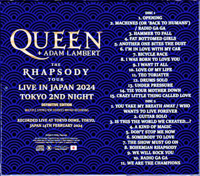 DISC 1 01. OPENING 02. MACHINES (OR 'BACK TO HUMANS') / RADIO GA GA 03. HAMMER TO FALL 04. FAT BOTTOMED GIRLS 05. ANOTHER ONE BITES THE DUST 06. I'M IN LOVE WITH MY CAR 07. BICYCLE RACE 08. I WAS BORN TO LOVE YOU 09. I WANT IT ALL 10. LOVE OF MY LIFE 11. TEO TORIATTE 12. DRUMS SOLO 13. UNDER PRESSURE 14. TIE YOUR MOTHER DOWN 15. CRAZY LITTLE THING CALLED LOVE DISC 2 01. YOU TAKE MY BREATH AWAY / WHO WANTS TO LIVE FOREVER 02. GUITAR SOLO 03. IS THIS THE WORLD WE CREATED...? 04. A KIND OF MAGIC 05. DON'T STOP ME NOW 06. SOMEBODY TO LOVE 07. THE SHOW MUST GO ON 08. BOHEMIAN RHAPSODY 09. WE WILL ROCK YOU 10. RADIO GA GA 11. WE ARE THE CHAMPIONS BLU-RAY DISC LIVE AT TOKYO DOME, TOKYO, JAPAN 14TH FEBRUARY 2024 01. YOU TAKE MY BREATH AWAY / WHO WANTS TO LIVE FOREVER 02. GUITAR SOLO 03. IS THIS THE WORLD WE CREATED... 04. A KIND OF MAGIC 05. DON'T STOP ME NOW 06. SOMEBODY TO LOVE 07. THE SHOW MUST GO ON 08. BOHEMIAN RHAPSODY 09. WE WILL ROCK YOU 10. RADIO GA GA 11. WE ARE THE CHAMPIONS