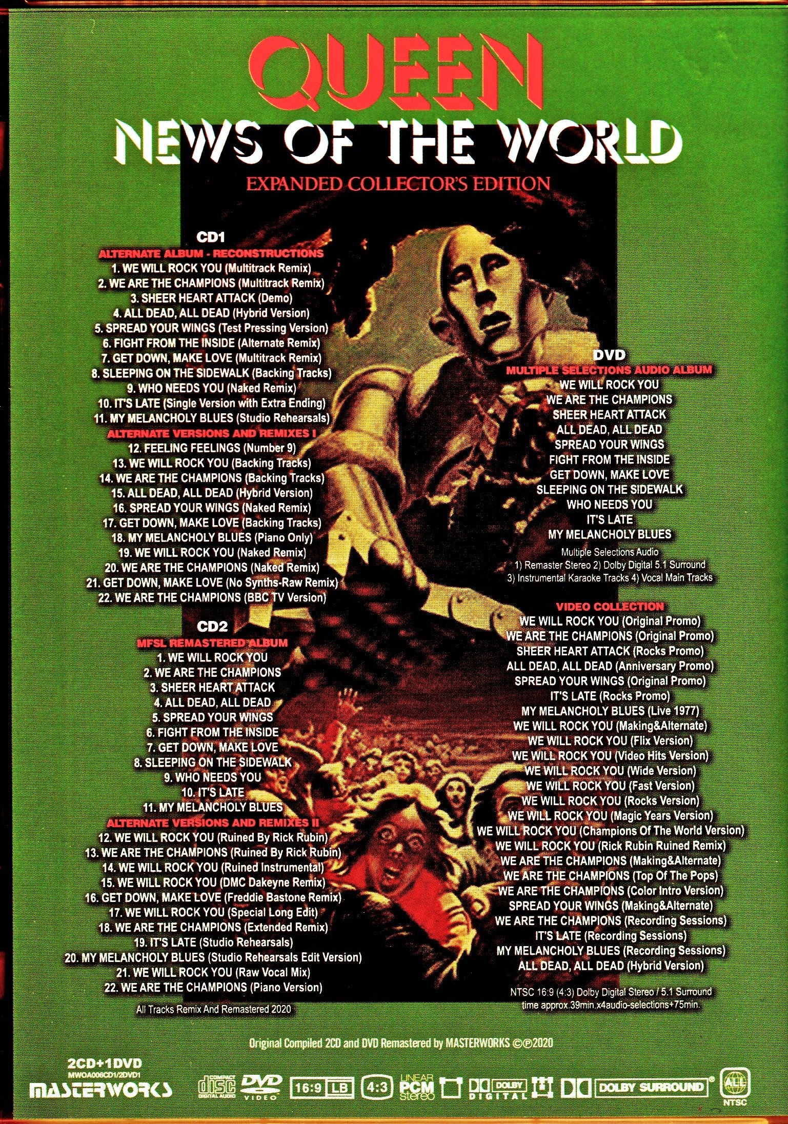 CD1 ALTERNATE ALBUM - RECONSTRUCTIONS 1. WE WILL ROCK YOU (Multitrack Remix) 2. WE ARE THE CHAMPIONS (Multitrack Remix) 3. SHEER HEART ATTACK (Demo) 4. ALL DEAD, ALL DEAD (Hybrid Version) 5. SPREAD YOUR WINGS ( Test Pressing Version) 6. FIGHT FROM THE INSIDE (Alternate Remix) 7. GET DOWN, MAKE LOVE (Multitrack Remix) 8. SLEEPING ON THE SIDEWALK (Backing Tracks) 9. WHO NEEDS YOU (Naked Remix) 10. IT'S LATE (Single Version with Extra Ending) 11. MY MELANCHOLY BLUES (Studio Rehearsals) ALTERNATE VERSIONS AND REMIXES I 12. FEELING FEELINGS (Number 9) 13. WE WILL ROCK YOU (Backing Tracks) 14. WE ARE THE CHAMPIONS (Backing Tracks) 15. ALL DEAD, ALL DEAD (Hybrid Version) 16. SPREAD YOUR WINGS (Naked Remix) 17. GET DOWN, MAKE LOVE (Backing Tracks) 18. MY MELANCHOLY BLUES (Piano Only) 19. WE WILL ROCK YOU (Naked Remix) 20. WE ARE THE CHAMPIONS (Naked Remix) 21. GET DOWN, MAKE LOVE (No Synths-Raw Remix) 22. WE ARE THE CHAMPIONS (BBC TV Version) CD2 MFSL REMASTERED ALBUM 1. WE WILL ROCK YOU 2. WE ARE THE CHAMPIONS 3. SHEER HEART ATTACK 4. ALL DEAD, ALL DEAD 5. SPREAD YOUR WINGS 6. FIGHT FROM THE INSIDE 7. GET DOWN, MAKE LOVE 8. SLEEPING ON THE SIDEWALK 9. WHO NEEDS YOU 10. IT'S LATE 11. MY MELANCHOLY BLUES ALTERNATE VERSIONS AND REMIXES II 12. WE WILL ROCK YOU (Ruined By Rick Rubin) 13. WE ARE THE CHAMPIONS (Ruined By Rick Rubin) 14. WE WILL ROCK YOU (Ruined Instrumental) 15. WE WILL ROCK YOU (DMC Dakeyne Remix) 16. GET DOWN, MAKE LOVE (Freddie Bastone Remix) 17. WE WILL ROCK YOU (Special Long Edit) 18. WE ARE THE CHAMPIONS (Extended Remix) 19. IT'S LATE (Studio Rehearsals) 20. MY MELANCHOLY BLUES (Studio Rehearsals Edit Version) 21. WE WILL ROCK YOU (Raw Vocal Mix) 22. WE ARE THE CHAMPIONS (Piano Version) All Tracks Remix and Remastered 2020 DVD MULTIPLE SELECTIONS AUDIO ALBUM WE WILL ROCK YOU WE ARE THE CHAMPIONS SHEER HEART ATTACK ALL DEAD, ALL DEAD SPREAD YOUR WINGS FIGHT FROM THE INSIDE GET DOWN, MAKE LOVE SLEEPING ON THE SIDEWALK WHO NEEDS YOU IT'S LATE MY MELANCHOLY BLUES Multiple Selections Audio 1) Remaster Stereo 2) Dolby Digital 5.1 Surround 3) Instrumental Karaoke Tracks 4) Vocal Main Tracks VIDEO COLLECTION WE WILL ROCK YOU (Original Promo) WE ARE THE CHAMPIONS (Original Promo) SHEER HEART ATTACK (Rocks Promo) ALL DEAD, ALL DEAD (Anniversary Promo) SPREAD YOUR WINGS (Original Promo) IT'S LATE (Rocks Promo) MY MELANCHOLY BLUES (Live 1977) WE WILL ROCK YOU (Making&Alternate) WE WILL ROCK YOU (Flix Version) WE WILL ROCK YOU (Video Hits Version) WE WILL ROCK YOU (Wide Version) WE WILL ROCK YOU (Fast Version) WE WILL ROCK YOU (Rocks Version) WE WILL ROCK YOU (Magic Years Version) WE WILL ROCK YOU (Champions Of The World Version) WE WILL ROCK YOU (Rick Rubin Ruined Remix) WE ARE THE CHAMPIONS (Making&Alternate) WE ARE THE CHAMPIONS (Top Of The Pops) WE ARE THE CHAMPIONS (Color Intro Version) SPREAD YOUR WINGS (Making&Alternate) WE ARE THE CHAMPIONS (Recording Sessions) IT'S LATE (Recording Sessions) MY MELANCHOLY BLUES (Recording Sessions) ALL DEAD, ALL DEAD (Hybrid Version) NTSC 16:9 (4:3) Dolby Digital Stereo / 5.1 Surround time approx.39min.x4audio-selections+75min.