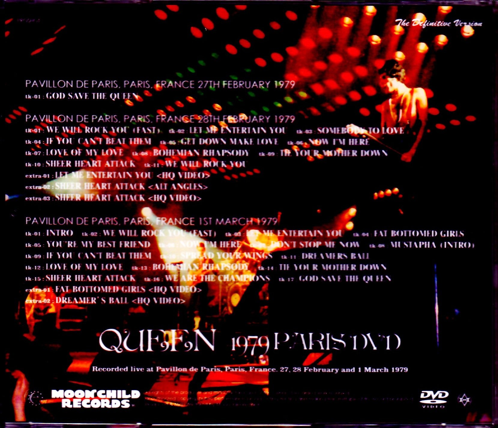 tk-01 : GOD SAVE THE QUEEN PAVILLON DE PARIS, PARIS, FRANCE 28TH FEBRUARY 1979 tk-01 : WE WILL ROCK YOU (FAST) tk-02 : LET ME ENTERTAIN YOU tk-03 : SOMEBODY TO LOVE tk-04 : IF YOU CAN'T BEAT THEM tk-05 : GET DOWN MAKE LOVE tk-06 : NOW I'M HERE tk-07 : LOVE OF MY LOVE tk-08 : BOHEMIAN RHAPSODY tk-09 : TIE YOUR MOTHER DOWN tk-10 : SHEER HEART ATTACK tk-11 : WE WILL ROCK YOU extra- 01: LET ME ENTERTAIN YOU extra-02: SHEER HEART ATTACK extra-03 : SHEER HEART ATTACK PAVILLON DE PARIS, PARIS, FRANCE 1ST MARCH 1979 tk-01 : INTRO tk-02 : WE WILL ROCK YOU (FAST) tk-03 : LET ME ENTERTAIN YOU tk-04 : FAT BOTTOMED GIRLS tk- 05 : YOU'RE MY BEST FRIEND tk-06 : NOW I'M HERE [CUT] tk-07 : DON'T STOP ME NOW tk-08 : MUSTAPHA (INTRO) tk-09 : IF YOU CAN'T BEAT THEM [CUT] tk-10 : SPREAD YOUR WINGS tk-11 : DREAMERS BALL tk-12 : LOVE OF MY LOVE [CUT] tk-13 : BOHEMIAN RHAPSODY [CUT] tk-14 : TIE YOUR MOTHER DOWN [CUT] tk-15 : SHEER HEART ATTACK [CUT] tk-16 : WE ARE THE CHAMPIONS [CUT] tk-17 : GOD SAVE THE QUEEN [ CUT] extra-01 : FAT BOTTOMED GIRLS extra-02 : DREAMER’S BALL Recorded live at Pavillon de Paris, Paris, France. 27th, 28th February & 1st March 1979
