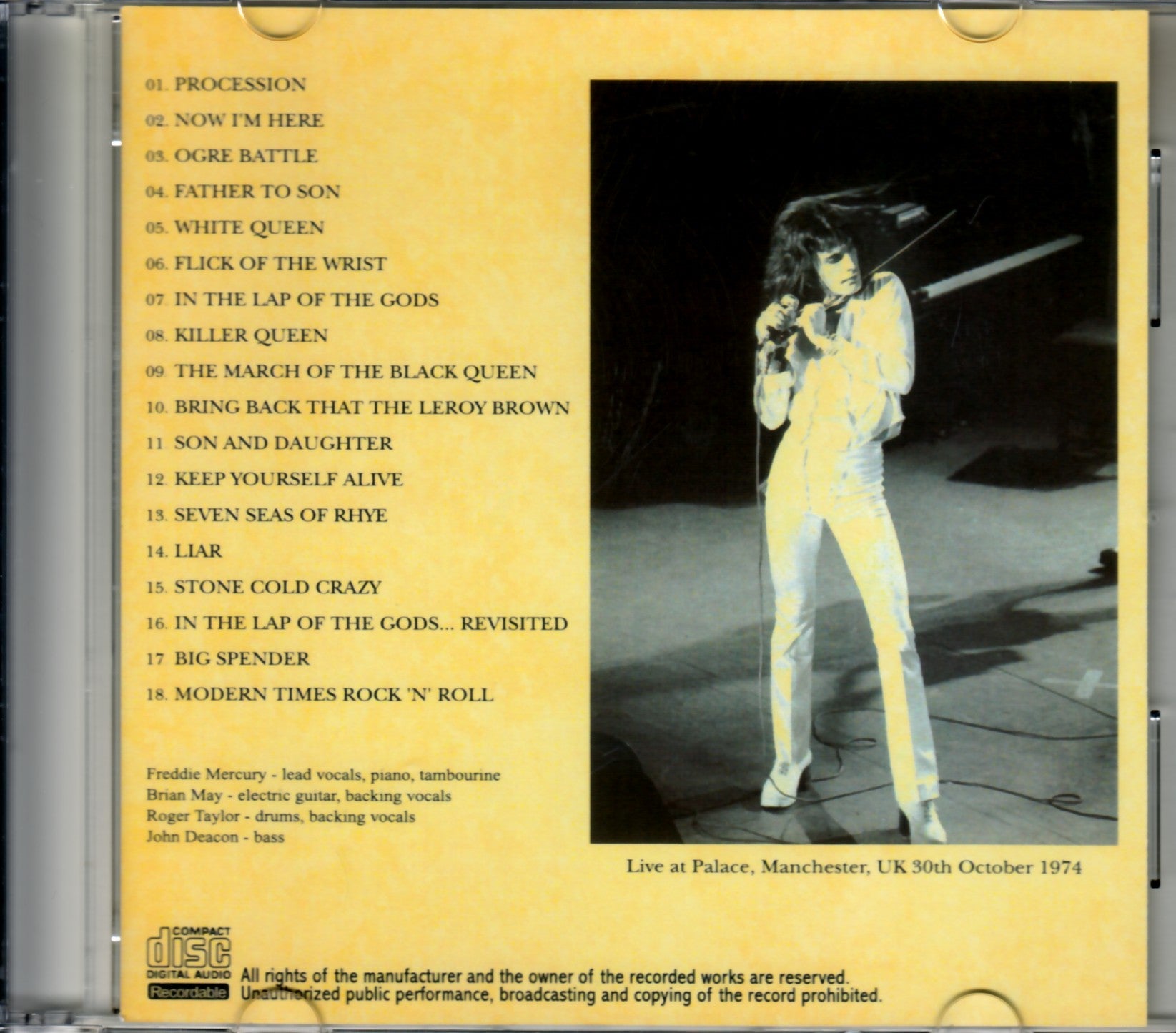 This is a live album of the “Manchester performance on October 30, 1974” which was the first day of the valuable “SHEER HEART ATTACK TOUR”. On this day, several types of bootlegs were born from one recording, each with advantages and disadvantages. What has appeared this time is a combination of two of the best types by overseas enthusiasts, patching the overall image of the show into the best shape. Specifically, the source is from the opening "Procession" to 5 minutes 21 seconds of "Son And Doughter" (1), and the source is from 5 minutes 22 seconds to the last "Modern Times Rock 'n' Roll" (2) is. As expected, at the moment of switching, you can tell that "Ah, it has changed", but since it is a master that originally started from the same recording, there is almost no sense of discomfort. Now, before we get into the details of the live album, let's organize the schedule for now. The last day of the previous work "QUEEN II TOUR" was May 11, 1974, and after that "SHEER HEART ATTACK" was produced from July to September. The lead single "Killer Queen/Flick of the Wrist" was released the following day on October 21st. "SHEER HEART ATTACK" will be released on November 8th, so the first day of the tour, "October 30th", is 9 days after the lead single and 9 days before the album's release. Under such circumstances, the show is filled with the heat of the upswing and the excitement of the first day. In the new song, the performance seems a bit stiff, and the audience listens intently. It was a brand new live show for both the band and the audience to confirm each other through their new songs, but the single ``Flick Of The Wrist'' was released as a single, and the intro of ``Killer Queen'' caused a roar of excitement. It rolls around. Yes, the audience here isn't confused by the new songs. Fans who have been looking forward to QUEEN's new song are gathering, and there is a sense of excitement as they wonder what kind of song will pop up next. The sound has a muffled feel, and it is not a universal type like "SHEFFIELD 1974", but a "first day record" type. However, it is never full of noise, and the nuances of such a show can be heard perfectly. QUEEN has started climbing the ladder of success, and we can't wait to hear their album. It is a unique mood that was felt in “SHEFFIELD 1974”, but on the first day, it appeared even more strongly. A live album that fully captures the atmosphere that can only be found in England at this time. Live at Palace, Manchester, UK 30th October 1974 AMAZING/TRULY AMAZING SOUND (69;57) 1. Procession 2. Now I'm Here 3. Ogre Battle 4. Father To Son 5. White Queen 6. Flick Of The Wrist 7 In The Lap Of The Gods 8. Killer Queen 9. The March Of The Black Queen 10. Bring Back That The Leroy Brown 11. Son And Daughter 12. Keep Yourself Alive 13. Seven Seas Of Rhye 14. Liar 15. Stone Cold Crazy 16. In The Lap Of The Gods... Revisited 17. Big Spender 18. Modern Times Rock 'n' Roll