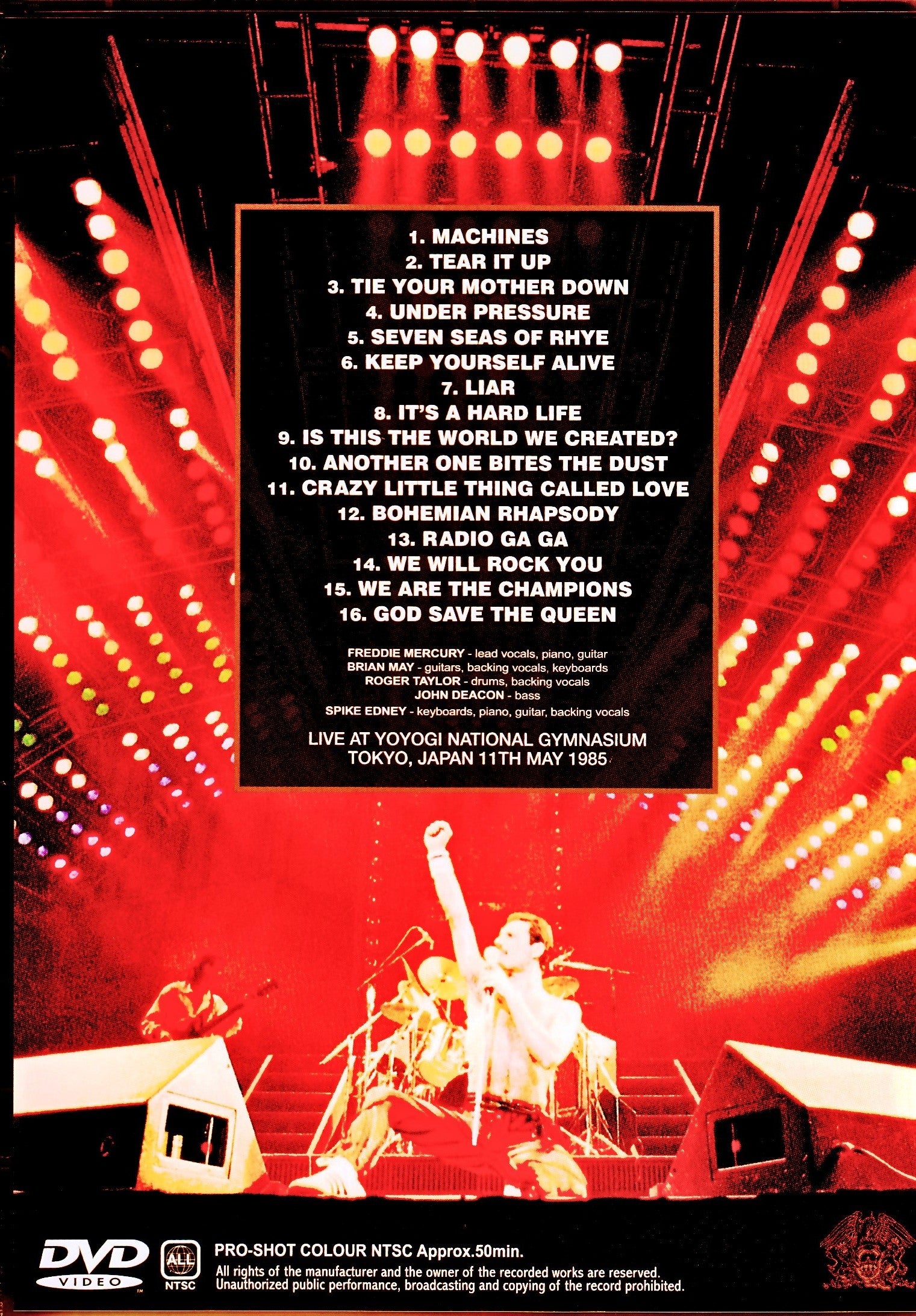 1. Machines ★Intro 4 seconds long 2. Tear It Up 3. Tie Your Mother Down 4. Under Pressure 5. Seven Seas Of Rhye 6. Keep Yourself Alive 7. Liar 8. It's A Hard Life 9. Is This The World We Created? 10. Another One Bites The Dust 11. Crazy Little Thing Called Love 12. Bohemian Rhapsody 13. Radio Ga Ga 14. We Will Rock You 15. We Are The Champions 16. God Save The Queen ★Last video is 8 seconds long Long PRO-SHOT COLOR NTSC Approx.50min.