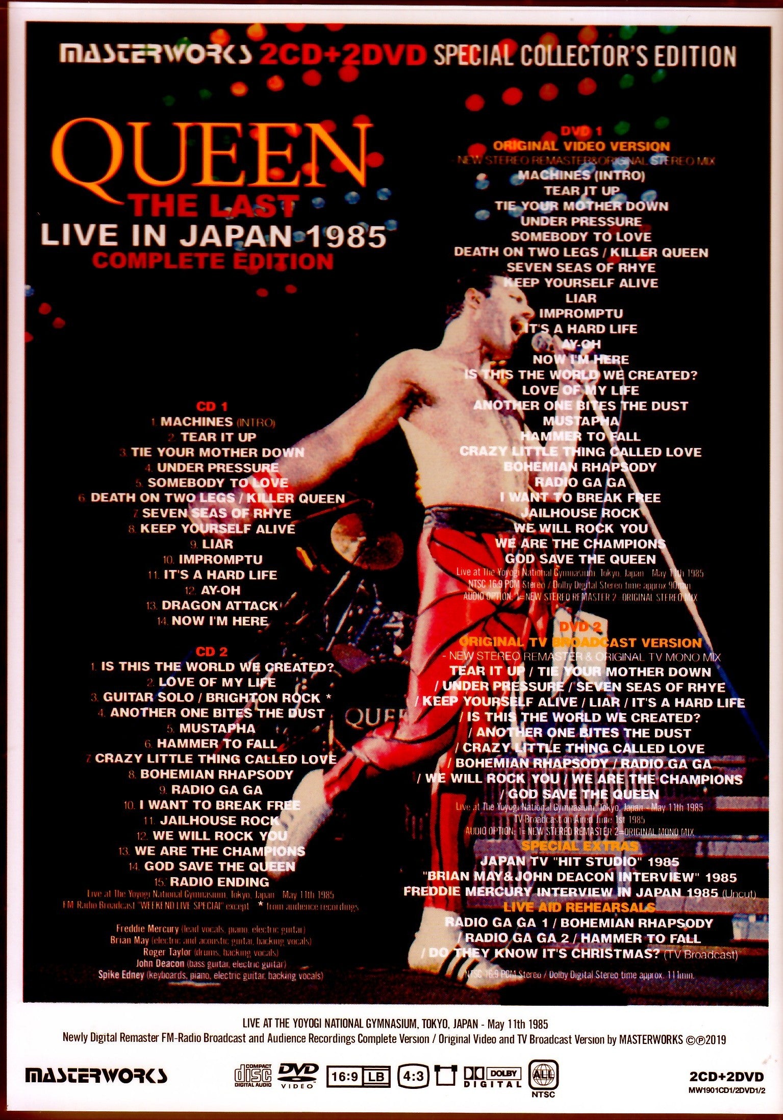 CD 1 1. MACHINES (INTRO) 2. TEAR IT UP 3. TIE YOUR MOTHER DOWN 4. UNDER PRESSURE 5. SOMEBODY TO LOVE 6. DEATH ON TWO LEGS / KILLER QUEEN 7. SEVEN SEAS OF RHYE 8. KEEP YOURSELF ALIVE 9. LIAR 10. IMPROMPTU 11. IT'S A HARD LIFE 12. AY-OH 13. DRAGON ATTACK 14. NOW I'M HERE CD 2 1. IS THIS THE WORLD WE CREATED? 2. LOVE OF MY LIFE 3. GUITAR SOLO / BRIGHTON ROCK * 4. ANOTHER ONE BITES THE DUST 5. MUSTAPHA 6. HAMMER TO FALL 7. CRAZY LITTLE THING CALLED LOVE 8. BOHEMIAN RHAPSODY 9. RADIO GA GA 10. I WANT TO BREAK FREE 11. JAILHOUSE ROCK 12. WE WILL ROCK YOU 13 WE ARE THE CHAMPIONS 14. GOD SAVE THE QUEEN 15. RADIO ENDING Live at The Yoyogi National Gymnasium, Tokyo, Japan - May 11th 1985 FM-Radio Broadcast "WEEKEND LIVE SPECIAL"except - * from audience recordings DVD 1 ORIGINAL VIDEO VERSION - NEW STEREO REMASTER&ORIGINAL STEREO MIX MACHINES (INTRO) TEAR IT UP TIE YOUR MOTHER DOWN UNDER PRESSURE SOMEBODY TO LOVE DEATH ON TWO LEGS / KILLER QUEEN SEVEN SEAS OF RHYE KEEP YOURSELF ALIVE LIAR IMPROMPTU IT'S A HARD LIFE AY-OH NOW I'M HERE IS THIS THE WORLD WE CREATED? LOVE OF MY LIFE ANOTHER ONE BITES THE DUST MUSTAPHA HAMMER TO FALL CRAZY LITTLE THING CALLED LOVE BOHEMIAN RHAPSODY RADIO GA GA I WANT TO BREAK FREE JAILHOUSE ROCK WE WILL ROCK YOU WE ARE THE CHAMPIONS GOD SAVE THE QUEEN Live at The Yoyogi National Gymnasium, Tokyo, Japan - May 11th 1985 NTSC 16:9 PCM Stereo / Dolby Digital Stereo time approx.90min. AUDIO OPTION: 1=NEW STEREO REMASTER 2=ORIGINAL STEREO MIX DVD 2 ORIGINAL TV BROADCAST VERSION - NEW STEREO REMASTER & ORIGINAL TV MONO MIX TEAR IT UP / TIE YOUR MOTHER DOWN / UNDER PRESSURE / SEVEN SEAS OF RHYE / KEEP YOURSELF ALIVE / LIAR / IT'S A HARD LIFE / IS THIS THE WORLD WE CREATED? / ANOTHER ONE BITES THE DUST / CRAZY LITTLE THING CALLED LOVE / BOHEMIAN RHAPSODY / RADIO GA GA / WE WILL ROCK YOU / WE ARE THE CHAMPIONS / GOD SAVE THE QUEEN Live at The Yoyogi National Gymnasium, Tokyo, Japan - May 11th 1985 TV Broadcast on Aired June 1st 1985 AUDIO OPTION: 1= NEW STEREO REMASTER 2=ORIGINAL MONO MIX SPECIAL EXTRAS JAPAN TV "HIT STUDIO" 1985 / "BRIAN MAY&JOHN DEACON INTERVIEW" 1985 / FREDDIE MERCURY INTERVIEW IN JAPAN 1985 (Uncut) LIVE AID REHEARSALS RADIO GA GA 1 / BOHEMIAN RHAPSODY / RADIO GA G.A.2 / HAMMER TO FALL / DO THEY KNOW IT'S CHRISTMAS? (TV Broadcast) NTSC 16:9 PCM Stereo / Dolby Digital Stereo time approx. 111min.