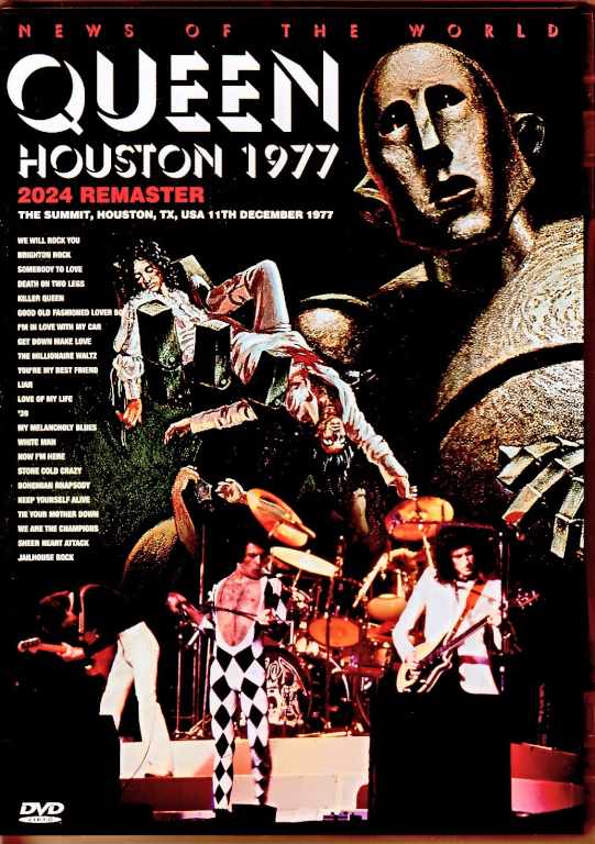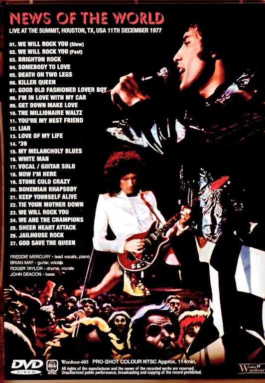 The Summit, Houston, TX, USA 11th December 1977 PRO-SHOT UPGRADE!!!!! 1. A+W:We Will Rock You (Slow) 2. A+W:We Will Rock You (Fast) 3. Aのみ:Brighton Rock 4. A+X:Somebody To Love 5. A+X:Death On Two Legs 6. A+X:Killer Queen 7. Aのみ:Good Old Fashioned Lover Boy 8. A+X:I'm In Love With My Car 9. A+W:Get Down Make Love 10. A+Y:The Millionaire Waltz 11. Aのみ:You're My Best Friend 12. A+W→X:Liar 13. A+W→X:Love Of My Life 14. A+X:'39 15. A→Y→W→B:My Melancholy Blues 16. B→A:White Man 17. Aのみ:Vocal / Guitar Solo 18. A+B:Now I'm Here 19. Aのみ:Stone Cold Crazy 20. Aのみ:Bohemian Rhapsody 21. Aのみ:Keep Yourself Alive 22. Aのみ:Tie Your Mother Down 23. A→Z→W→Z:We Will Rock You 24. B→W→A:We Are The Champions 25. Z→A→W→A:Sheer Heart Attack 26. Aのみ:Jailhouse Rock 27. Aのみ:God Save The Queen Tracks infomrmation/details for foreign customers 1. We Will Rock You (Slow) - */@/* 2. We Will Rock You (Fast) - */@/* 3. Brighton Rock - * 4. Somebody To Love - */**/* 5. Death On Two Legs - */**/* 6. Killer Queen - */**/* 7. Good Old Fashioned Lover Boy - * 8. I’m In Love With My Car - */**/* 9. Get Down Make Love - */@/* 10. The Millionaire Waltz - */@@@/* 11. You’re My Best Friend - * 12. Liar - */@/**/* 13. Love Of My Life - */@/**/* 14. ‘39 - */**/* 15. My Melancholy Blues - */@@@/@/*** 16. White Man - ***/* 17. Vocal / Guitar Solo - * 18. Now I’m Here - */***/* 19. Stone Cold Crazy - * 20. Bohemian Rhapsody - * 21. Keep Yourself Alive - * 22. Tie Your Mother Down - * 23. We Will Rock You - */@@/@/@@ 24. We Are The Champions - ***/@/* 25. Sheer Heart Attack - @@/*/@/* 26. Jailhouse Rock - * 27. God Save The Queen - * * Video Master > PAL VHS (2?) > DVD ** A Night at the Opera (30th Anniversary DVD) *** Video Master > PAL VHS (unknown generation) > Mr. Fahrenheit DVD @ Rock The World / American Dream 2017 documentaries @@ The Magic Years @@@ Absolute Greatest / iTunes Online Videos 2009 & 2011 PRO-SHOT COLOUR NTSC Approx. 114min.