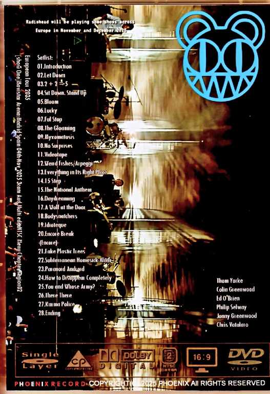 This DVD features a 3-camera audio multi-recording of the band's performance at Movistar Arena in Madrid, Spain on November 4th, 2025, as part of their European Tour. Recorded on the first day of their first tour in seven years, this DVD truly captures the unique atmosphere that only Radiohead can create. The stage set, set up in the center of the venue, is a highlight of this tour, and the songs performed on the day were a mix of new and old hits, creating a vibrant and cohesive performance that you can only experience at this moment. European Tour 2025 [show One]Movistar Arena:Madrid Spain 04th Nov 2025 3cam Aud Multi edit NTSC Menu Chapter region02 01.Introduction 02.Let Down 03.2 + 2 = 5 04.Sit Down. Stand Up 05.Bloom 06.Lucky 07.Ful Stop 08.The Gloaming 09.Myxomatosis 10.No Surprises 11.Videotape 12.Weird Fishes/Arpeggi 13.Everything in Its Right Place 14.15 Step 15.The National Anthem 16.Daydreaming 17.A Wolf at the Door 18.Bodysnatchers 19.Idioteque 20.Encore Break -(Encore)- 21.Fake Plastic Trees 22.Subterranean Homesick Alien 23.Paranoid Android 24.How to Disappear Completely 25.You and Whose Army? 26.There There 27.Karma Police 28.Ending Thom Yorke – vocals, guitar, piano, keyboards Colin Greenwood – bass guitar Ed O'Brien – guitar, effects, backing vocals Philip Selway – drums, percussion Jonny Greenwood – guitar, keyboards, ondes Martenot, orchestral arrangements Chris Vatalaro – drums, percussion