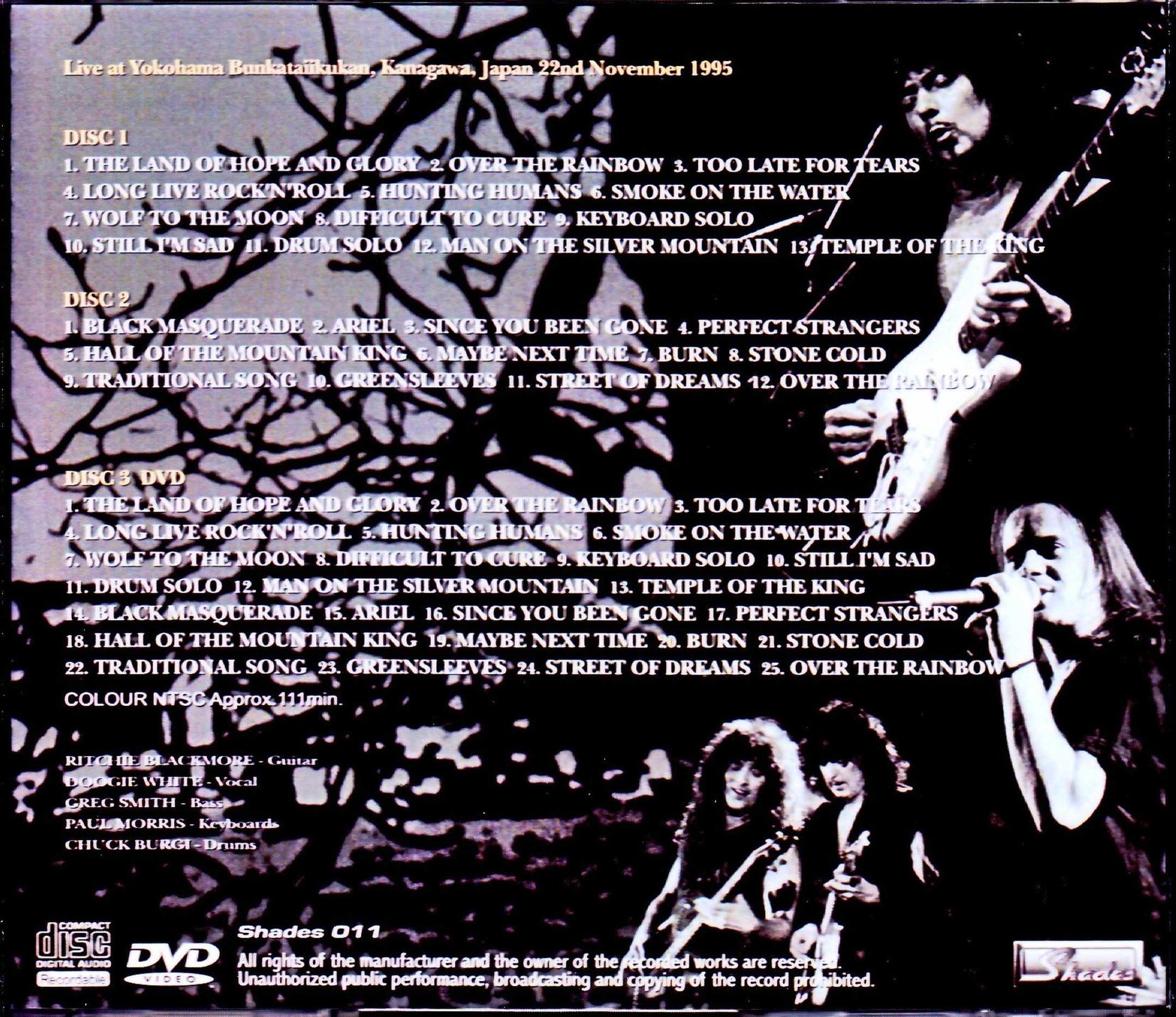 Disc 1 1. The Land Of Hope And Glory 2. Over The Rainbow 3. Too Late For Tears 4. Long Live Rock'n'Roll 5. Hunting Humans 6. Smoke On The Water 7. Wolf To The Moon 8. Difficult To Cure 9. Keyboard Solo 10. Still I'm Sad 11. Drum Solo 12. Man On The Silver Mountain 13. Temple Of The King Disc 2 1. Black Masquerade 2. Ariel 3. Since You Been Gone 4. Perfect Strangers 5. Hall Of The Mountain King 6. Maybe Next Time 7. Burn 8. Stone Cold 9. Traditional Song 10. Greensleeves 11. Street Of Dreams 12. Over The Rainbow Disc 3 DVD 1. The Land Of Hope And Glory 2. Over The Rainbow 3. Too Late For Tears 4. Long Live Rock'n'Roll 5. Hunting Humans 6. Smoke On The Water 7. Wolf To The Moon 8. Difficult To Cure 9. Keyboard Solo 10. Still I'm Sad 11. Drum Solo 12. Man On The Silver Mountain 13. Temple Of The King 14. Black Masquerade 15. Ariel 16. Since You Been Gone 17. Perfect Strangers 18. Hall Of The Mountain King 19. Maybe Next Time 20. Burn 21. Stone Cold 22. Traditional Song 23. Greensleeves 24. Street Of Dreams 25. Over The Rainbow COLOR NTSC Approx.111min. Ritchie Blackmore - Guitar Doogie White - Vocal Greg Smith - Bass Paul Morris - Keyboards Chuck Burgi - Drums