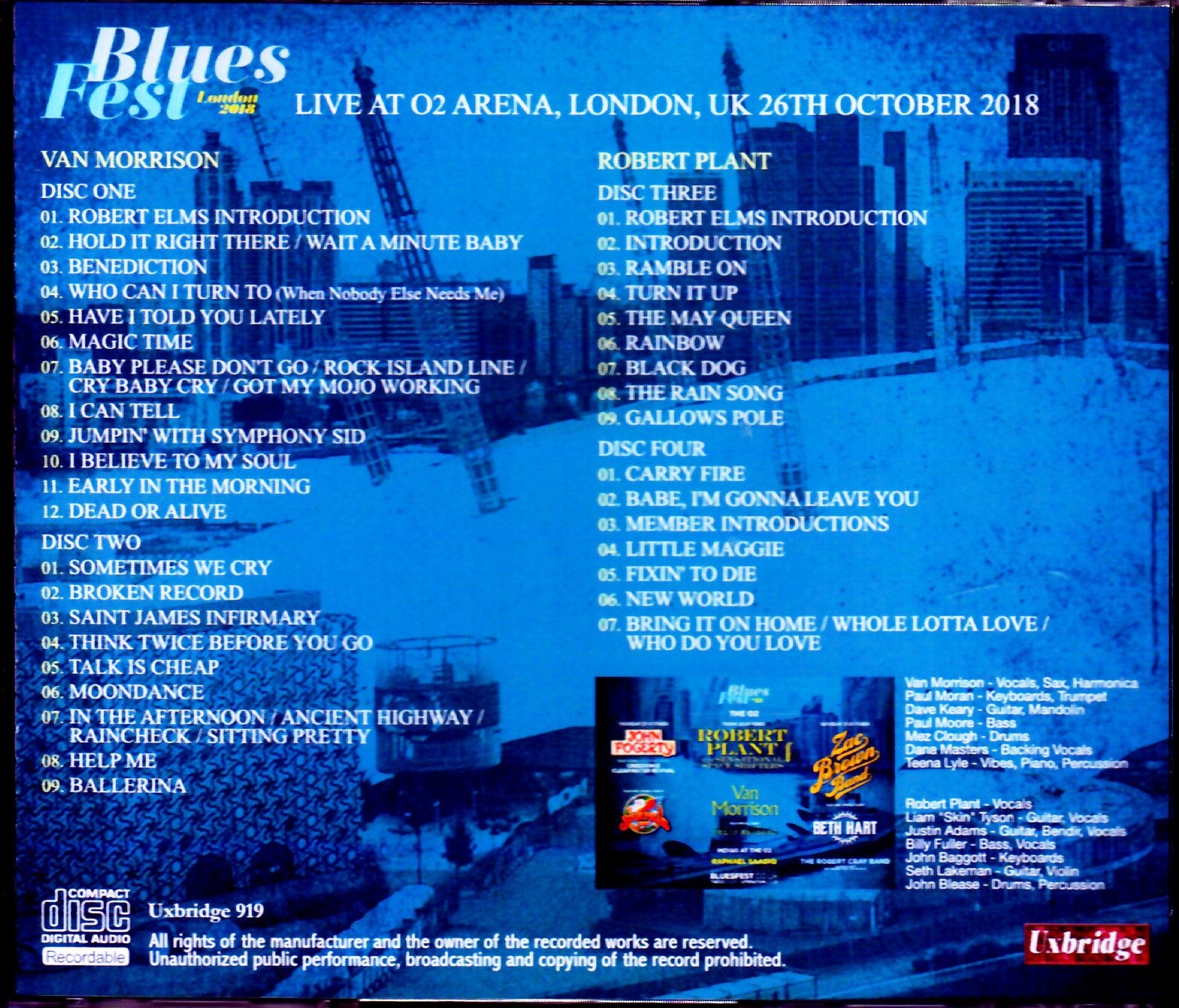 Disc 1(44:23) 1. Robert Elms Introduction 2. Hold It Right There/Wait A Minute Baby 3. Benediction 4. Who Can I Turn To (When Nobody Else Needs Me) 5. Have I Told You Lately 6. Magic Time 7. Baby Please Don't Go/Rock Island Line/Cry Baby Cry/Got My Mojo Working 8. I Can Tell 9. Jumpin' With Symphony Sid 10. I Believe To My Soul 11. Early In The Morning 12. Dead Or Alive Disc 2(49:28) 1. Sometimes We Cry 2. Broken Record 3. Saint James Infirmary 4. Think Twice Before You Go 5. Talk Is Cheap 6. Moondance 7. In The Afternoon/Ancient Highway/Raincheck/Sitting Pretty 8. Help Me 9. Ballerina ROBERT PLANT Disc 3(43:28) 1. Robert Elms Introduction 2. Introduction 3. Ramble On 4. Turn It Up 5. The May Queen 6. Rainbow 7. Black Dog 8. The Rain Song 9. Gallows Pole Disc 4(51:33) 1. Carry Fire 2. Babe, I'm Gonna Leave You 3. Member Introductions 4. Little Maggie 5. Fixin' To Die 6. New World 7. Bring It On Home /Whole Lotta Love/Who Do You Love