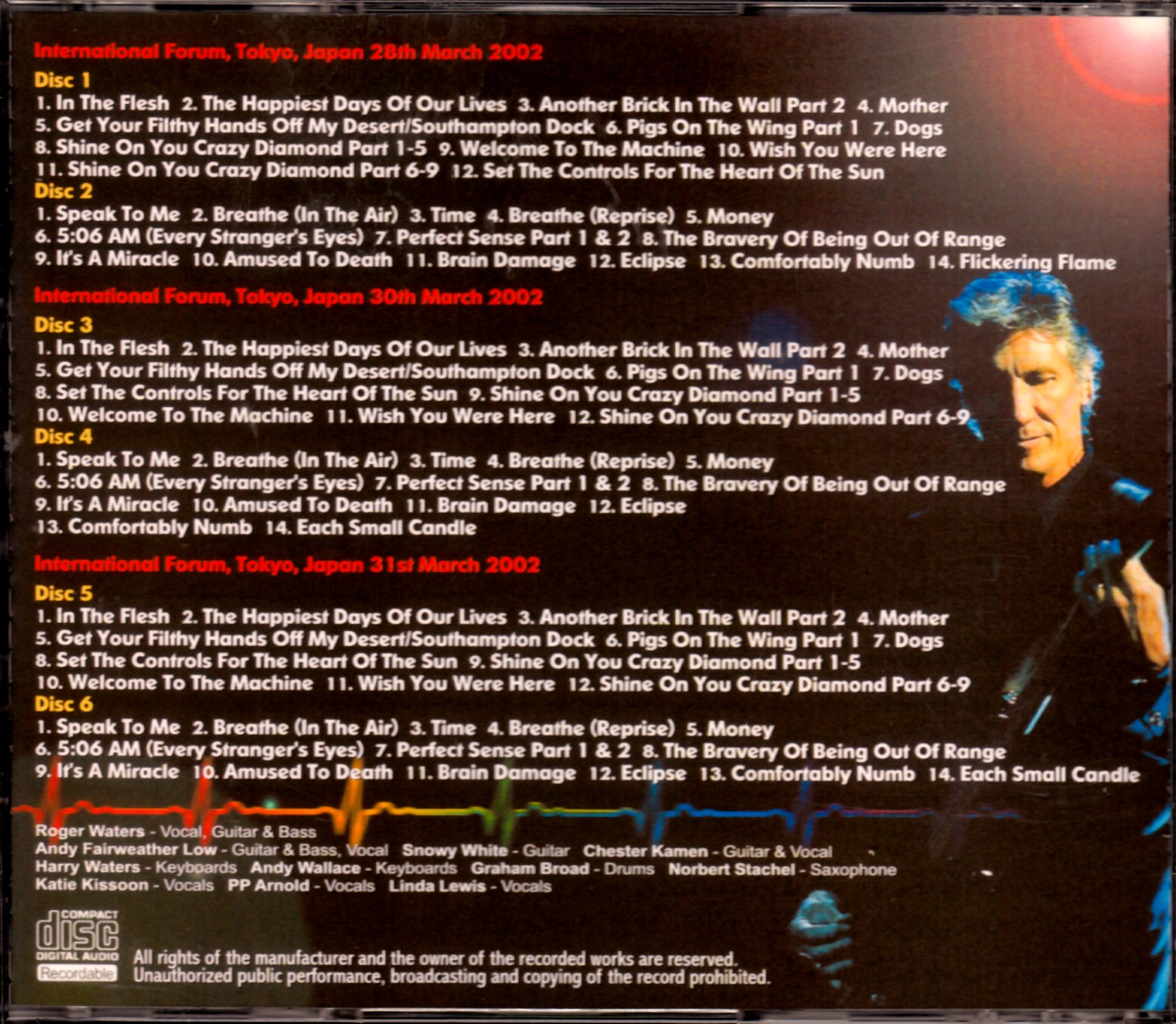 Disc 1 1. In The Flesh 2. The Happiest Days Of Our Lives 3. Another Brick In The Wall (Part 2) 4. Mother5. Get Your Filthy Hands Off My Desert / Southampton Dock 6. Pigs On The Wing (Part 1) 7. Dogs 8. Shine On You Crazy Diamond (Part 1 - 5) 9. Welcome To The Machine 10. Wish You Were Here 11. Shine On You Crazy Diamond (Part 6 - 9) 12. Set The Controls For The Heart Of The Sun Disc 2 1. Speak To Me 2. Breathe (In The Air) 3. Time 4. Breathe (Reprise) 5. Money 6. 5:06 AM (Every Stranger's Eyes) 7. Perfect Sense (Part 1 & 2) 8. The Bravery Of Being Out Of Range 9. It's A Miracle 10. Amused To Death 11. Brain Damage 12. Eclipse 13. Comfortably Numb 14. Flickering Flame [Live At International Forum, Tokyo, Japan 30th March 2002] Disc 3 1 In The Flesh 2. The Happiest Days Of Our Lives 3. Another Brick In The Wall (Part 2) 4. Mother 5. Get Your Filthy Hands Off My Desert / Southampton Dock 6. Pigs On The Wing (Part 1) 7. Dogs 8. Set The Controls For The Heart Of The Sun 9. Shine On You Crazy Diamond (Part 1 - 5) 10. Welcome To The Machine 11. Wish You Were Here 12. Shine On You Crazy Diamond (Part 6 - 9) Disc 4 1. Speak To Me 2. Breathe (In The Air) 3. Time 4. Breathe (Reprise) 5. Money 6. 5:06 AM (Every Stranger's Eyes) 7. Perfect Sense (Part 1 & 2) 8. The Bravery Of Being Out Of Range 9. It's A Miracle 10. Amused To Death 11. Brain Damage 12. Eclipse 13. Comfortably Numb 14. Each Small Candle [Live At International Forum, Tokyo, Japan 31st March 2002] Disc 5 1. In The Flesh 2. The Happiest Days Of Our Lives 3. Another Brick In The Wall (Part 2) 4. Mother 5. Get Your Filthy Hands Off My Desert / Southampton Dock 6. Pigs On The Wing (Part 1) 7. Dogs 8. Set The Controls For The Heart Of The Sun 9. Shine On You Crazy Diamond (Part 1 - 5) 10. Welcome To The Machine 11. Wish You Were Here 12. Shine On You Crazy Diamond (Part 6 - 9) Disc 6 1. Speak To Me 2. Breathe (In The Air) 3. Time 4. Breathe (Reprise) 5. Money 6. 5:06 AM (Every Stranger's Eyes) 7. Perfect Sense (Part 1 & 2) 8. The Bravery Of Being Out Of Range 9. It's A Miracle 10. Amused To Death 11. Brain Damage 12. Eclipse 13. Comfortably Numb 14. Each Small Candle Roger Waters - Vocal, Guitar & Bass Andy Fairweather Low - Guitar & Vocal Snowy White - Guitar Chester Kamen - Guitar & Vocal Harry Waters - Keyboards Andy Wallace - Keyboards Graham Broad - Drums Norbert Stachel - Saxophone Katie Kissoon - Vocals PP Arnold - Vocals Linda Lewis – Vocals