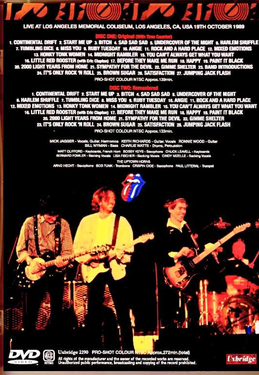 Disc 1 : 1. Continental Drift 2. Start Me Up 3. Bitch 4. Sad Sad Sad 5. Undercover Of The Night 6. Harlem Shuffle 7. Tumbling Dice 8. Miss You 9. Ruby Tuesday 10. Angie 11. Rock And A Hard Place 12. Mixed Emotions 13. Honky Tonk Women 14. Midnight Rambler 15. You Can't Always Get What You Want 16. Little Red Rooster (With Eric Clapton) 17. Before They Make Me Run 18. Happy 19. Paint It Black 20. 2000 Light Years From Home 21. Sympathy For The Devil 22. Gimme Shelter 23. Band Introductions 24. It's Only Rock 'N Roll 25. Brown Sugar 26. Satisfaction 27. Jumping Jack Flash [at Los Angeles Memorial Coliseum, Los Angeles, CA, USA 19th October 1989 : PRO-SHOT COLOUR NTSC Approx.139min / Original (With Time Counter)] Disc 2 : 1. Continental Drift 2. Start Me Up 3. Bitch 4. Sad Sad Sad 5. Undercover Of The Night 6. Harlem Shuffle 7. Tumbling Dice 8. Miss You 9. Ruby Tuesday 10. Angie 11. Rock And A Hard Place 12. Mixed Emotions 13. Honky Tonk Women 14. Midnight Rambler 15. You Can't Always Get What You Want 16. Little Red Rooster (With Eric Clapton) 17. Before They Make Me Run 18. Happy 19. Paint It Black 20. 2000 Light Years From Home 21. Sympathy For The Devil 22. Gimme Shelter 23. It's Only Rock 'N Roll 24. Brown Sugar 25. Satisfaction 26. Jumping Jack Flash [at Los Angeles Memorial Coliseum, Los Angeles, CA, USA 19th October 1989 : PRO-SHOT COLOUR NTSC Approx.133min / Remastered]