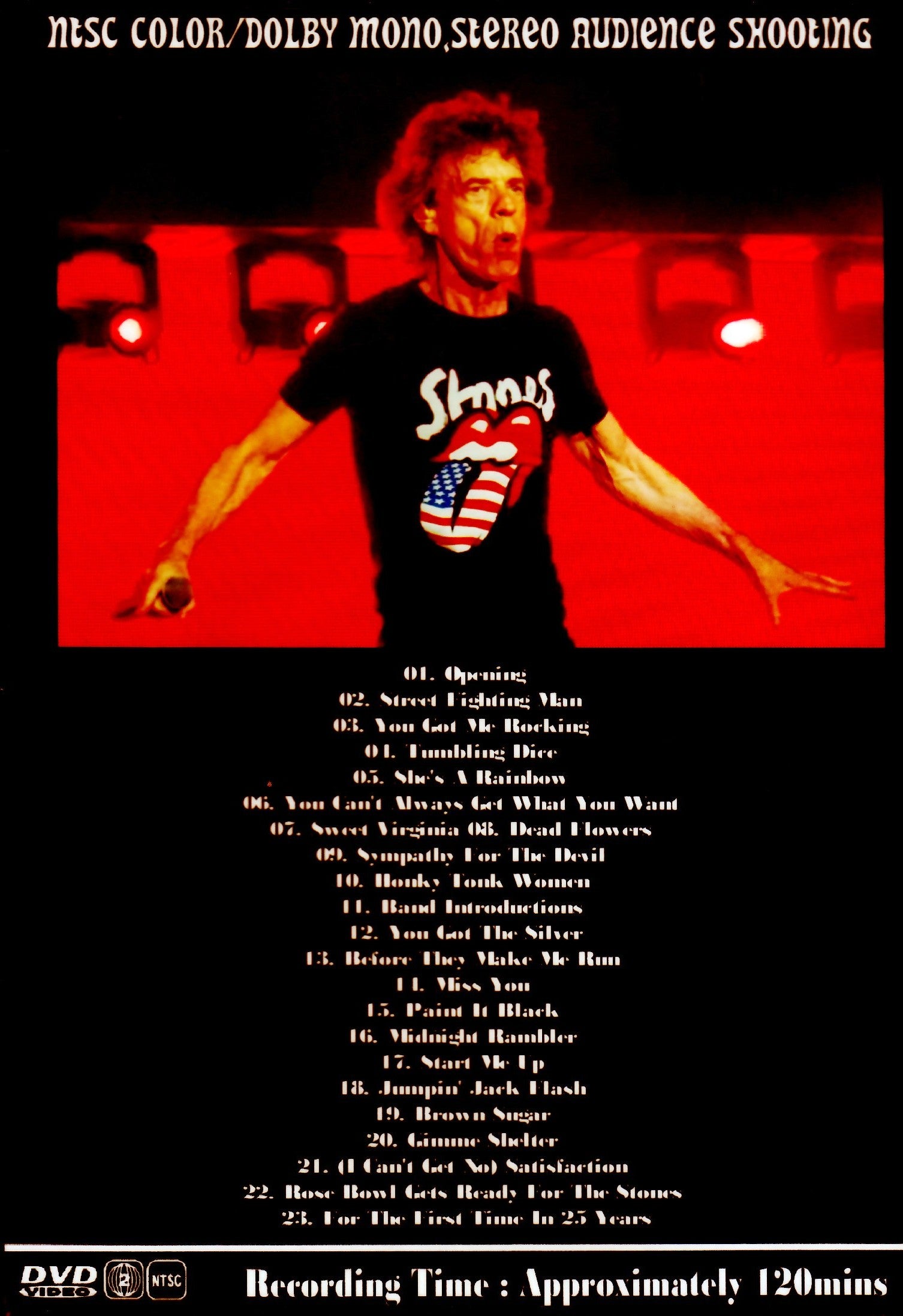 01. Opening 02. Jumpin' Jack Flash 03. Let's Spend The Night Together 04. Tumbling Dice 05. Out Of Control 06. Rocks Off 07. You Can't Always Get What You Want 08. Sweet Virginia 09. Let It Bleed 10 Sympathy For The Devil 11. Honky Tonk Women 12. You Got The Silver 13. Before They Make Me Run 14. Miss You 15. Midnight Rambler 16. Paint It Black 17. Start Me Up 18. Brown Sugar 19. Gimme Shelter 20 (I Can't Get No) Satisfaction NTSC 16:9 Wide Screen Dolby Digital Stereo time approx.113min.