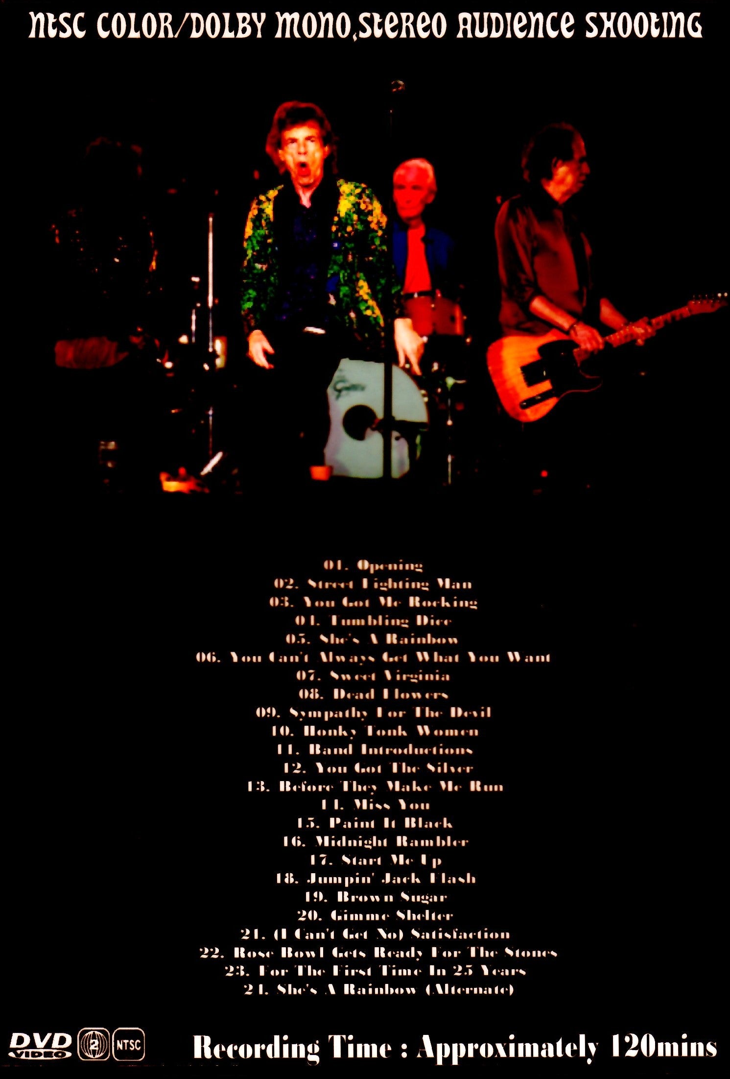 01. Opening 02. Street Fighting Man 03. You Got Me Rocking 04. Tumbling Dice 05. She's A Rainbow 06. You Can't Always Get What You Want 07. Sweet Virginia 08. Dead Flowers 09. Sympathy For The Devil 10. Honky Tonk Women 11. Band Introductions 12. You Got The Silver 13. Before They Make Me Run 14. Miss You 15. Paint It Black 16. Midnight Rambler 17. Start Me Up 18. Jumpin' Jack Flash 19. Brown Sugar 20. Gimme Shelter 21. (I Can't Get No) Satisfaction 22. Rose Bowl Gets Ready For The Stones 23. For The First Time In 25 Years 24. She's A Rainbow (Alternate) NTSC 16:9 Wide Screen Dolby Digital Stereo time approx .127min.