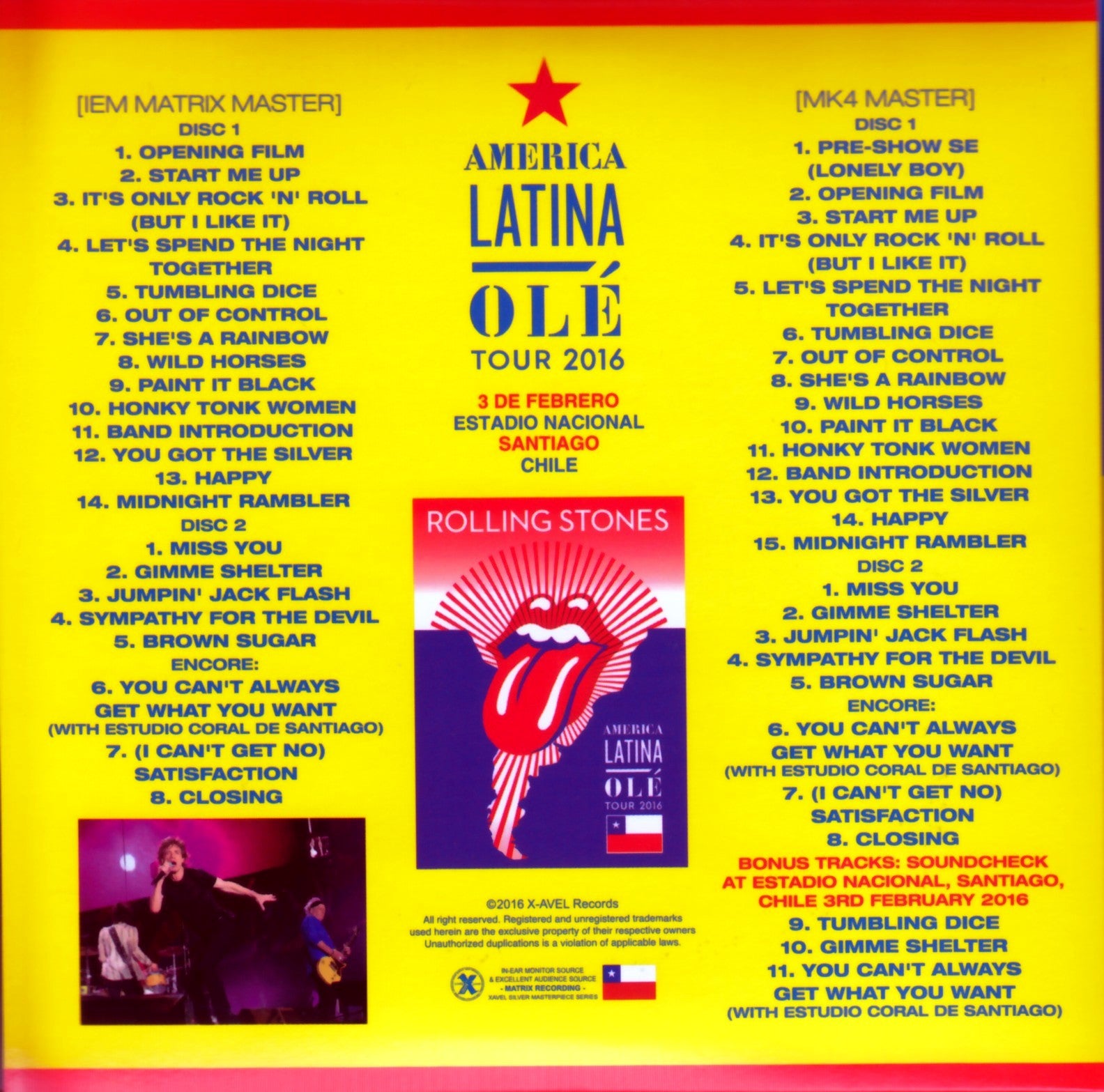 Disc 1 : 01. Opening Film 02. Start Me Up 03. It's Only Rock 'n' Roll 04. Let's Spend the Night Together 05. Tumbling Dice 06. Out of Control 07. She's a Rainbow 08. Wild Horses 09. Paint It Black 10. Honky Tonk Women 11. Band Introduction 12. You Got the Silver (Keith Richards on lead vocals) 13. Happy (Keith Richards on lead vocals) 14. Midnight Rambler Disc 2 : 01. Miss You 02. Gimme Shelter 03. Jumpin' Jack Flash 04. Sympathy for the Devil 05. Brown Sugar –encore- 06. You Can't Always Get What You Want (with Estudio Coral de Santiago) 07. (I Can't Get No) Satisfaction 08. Closing [ ?EL LIBERTADOR: IEM MATRIX MASTER :Multiple IEM + AUD Matrix Source] Disc 3 : 01. Pre-show SE (Lonely Boy) 02. Opening Film 03. Start Me Up 04. It's Only Rock 'n' Roll 05. Let's Spend the Night Together 06. Tumbling Dice 07. Out of Control 08. She's a Rainbow 09. Wild Horses 10. Paint It Black 11. Honky Tonk Women 12. Band Introduction 13. You Got the Silver (Keith Richards on lead vocals) 14. Happy (Keith Richards on lead vocals) 15. Midnight Rambler Disc 4 : 01. Miss You 02. Gimme Shelter 03. Jumpin' Jack Flash 04. Sympathy for the Devil 05. Brown Sugar –encore- 06. You Can't Always Get What You Want (with Estudio Coral de Santiago) 07. (I Can't Get No) Satisfaction 08. Closing [?EL LIBERTADOR: MK4 MASTER :Original MK4 Source] 09. Tumbling Dice 10. Gimme Shelter 11. You Can't Always Get What You Want (with Estudio Coral de Santiago) [Soundcheck at Estadio Nacional, Santiago, Chile 3rd February 2016] DVD : 01. Opening Film 02. Start Me Up 03. It's Only Rock 'n' Roll 04. Let's Spend the Night Together 05. Tumbling Dice 06. Out of Control 07. She's a Rainbow 08. Wild Horses 09. Paint It Black 10. Honky Tonk Women 11. Band Introduction 12. You Got the Silver (Keith Richards on lead vocals) 13. Happy (Keith Richards on lead vocals) 14. Midnight Rambler 15. Miss You 16. Gimme Shelter 17. Jumpin' Jack Flash 18. Sympathy for the Devil 19. Brown Sugar –enncore- 20. You Can't Always Get What You Want ( with Estudio Coral de Santiago) [Live at Estadio Nacional, Santiago, Chile 3rd February 2016]