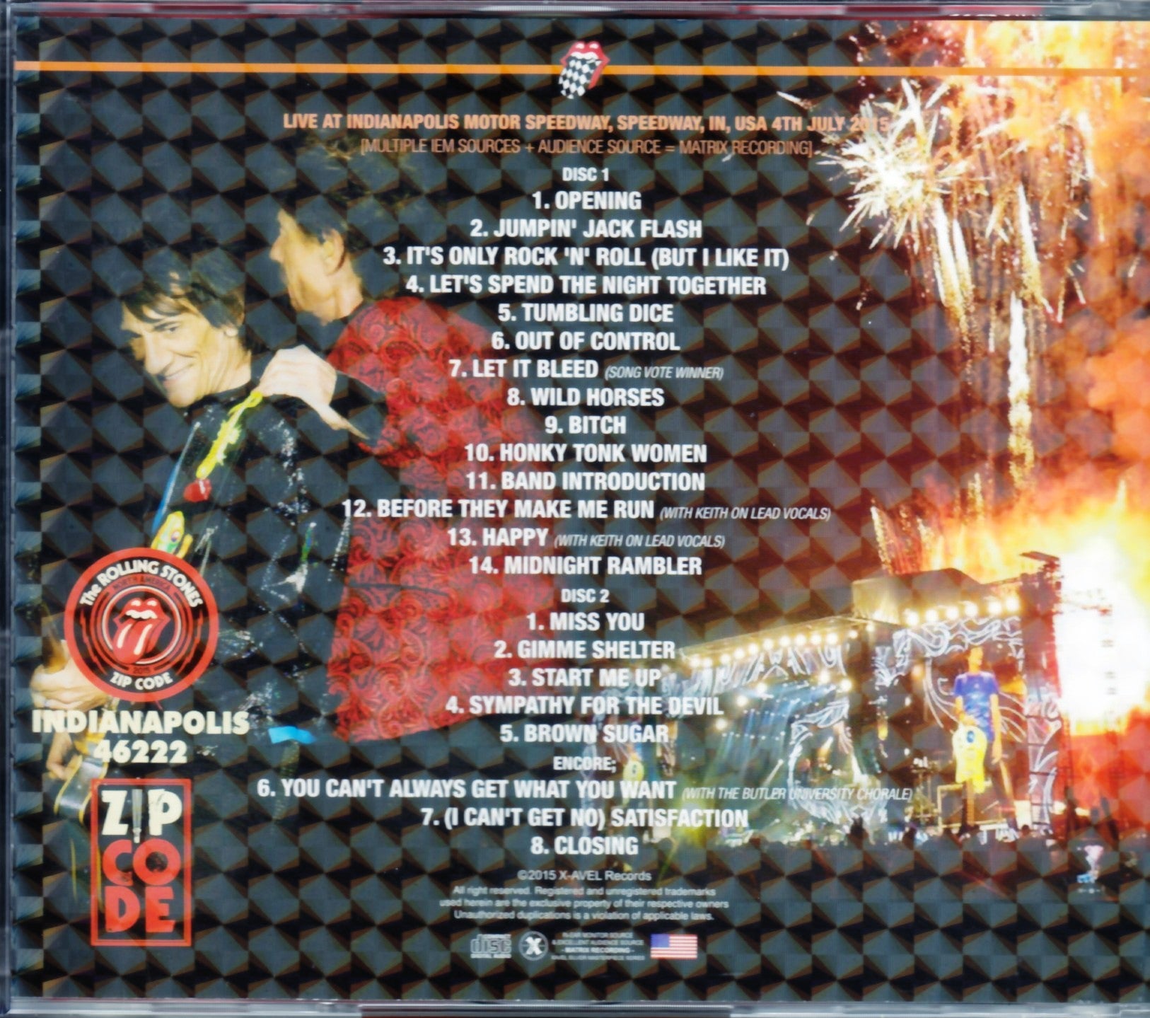 Disc 1 : 01. Opening 02. Jumpin' Jack Flash 03. It's Only Rock 'n' Roll (But I Like It) 04. Let's Spend the Night Together 05. Tumbling Dice 06. Out Of Control 07. Let It Bleed (Song Vote Winner) 08. Wild Horses 09. Bitch 10. Honky Tonk Women 11. Band Introduction 12. Before They Make Me Run (with Keith on lead vocals) 13. Happy (with Keith on lead vocals) 14. Midnight Rambler Disc 2: 01. Miss You 02. Gimme Shelter 03. Start Me Up 04. Sympathy For The Devil 05. Brown Sugar -encore- 06. You Can't Always Get What You Want (with the Butler University Chorale) 07. (I Can' t Get No) Satisfaction 08. Closing with Fireworks [Live at Indianapolis Motor Speedway, Speedway, IN, USA 4th July 2015 : Multiple IEM Sources + Audience Source = Matrix Recording] Personnel : Mick Jagger (Vocals, Guitar), Keith Richards (Guitar) , Vocals), Charlie Watts (Drums), Ronnie Wood (Guitar), Chuck Leavell (Keyboards), Darryl Jones (Bass), Lisa Fischer (Background Vocals), Bernard Fowler (Background Vocals), Tim Ries (Saxophone), Karl Denson (Tenor Saxophone) & Matt Clifford (Keyboards, French Horn)