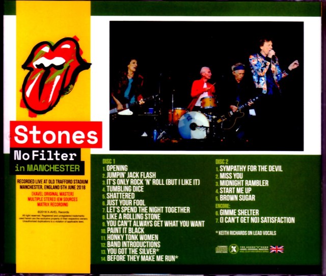 DISC 1 : 01. Opening/02. Jumpin' Jack Flash/03. It's Only Rock 'n' Roll (But I Like It)/04. Tumbling Dice/05. Shattered/06. Just Your Fool/07. Let's Spend The Night Together/08. Like A Rolling Stone/09. You Can't Always Get What You Want/10. Paint It Black/11. Honky Tonk Women/ 12. Band Introductions/13. You Got The Silver/14. Before They Make Me Run DISC 2 : 01. Sympathy For The Devil/02. Miss You/03. Midnight Rambler/04. Start Me Up/05. Brown Sugar/06. Gimme Shelter/07. (I Can't Get No) Satisfaction [Live at Old Trafford Football Stadium, Manchester, UK June 5th 2018 : ORIGINAL MASTER - Multiple Stereo IEM Sources Matrix Recording]