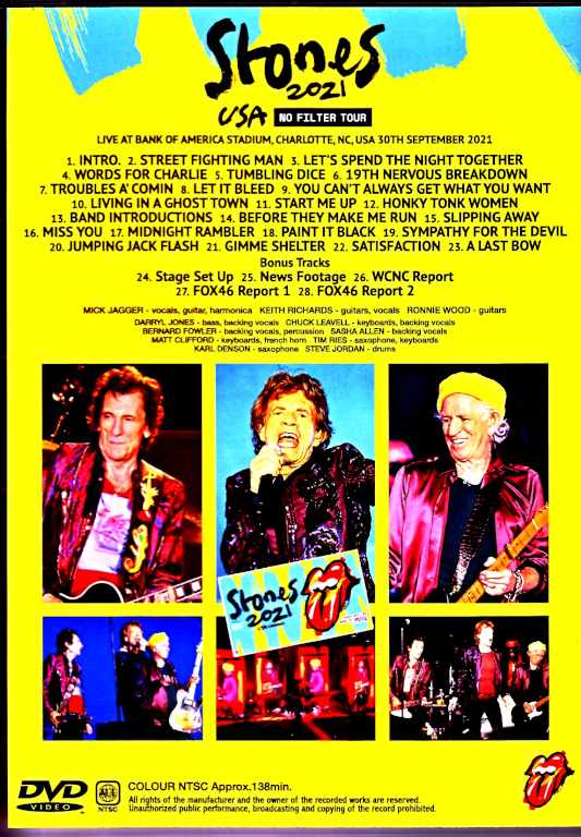 1. Introduction 2. Street Fighting Man 3. Let's Spend The Night Together 4. Words For Charlie 5. Tumbling Dice 6. 19th Nervous Breakdown 7. Troubles A’ Comin 8. Let It Bleed 9. You Can't Always Get What You Want 10. Living In A Ghost Town 11. Start Me Up 12. Honky Tonk Women 13. Band Introductions 14. Before They Make Me Run 15. Slipping Away 16. Miss You 17. Midnight Rambler 18. Paint It Black 19. Sympathy For The Devil 20. Jumping Jack Flash 21. Gimme Shelter 22. Satisfaction 23. A Last Bow Bonus Tracks 24. Stage Set Up 25. News Footage 26. WCNC Report 27. FOX46 Report I 28. FOX46 Report II COLOUR NTSC Approx.138min.