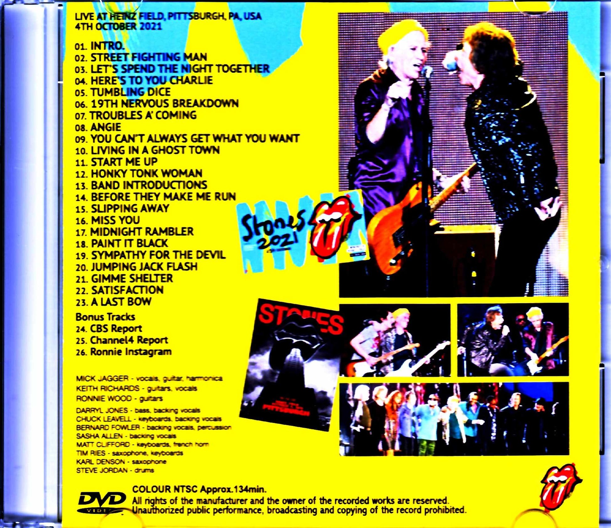 The highly popular 2021 edition of the "NO FILTER Tour" multi-camera audience work. The third installment of the series is now available! The first day's "ST. LOUIS 2021: MULTICAM" and the second day's "CHARLOTTE 2021: MULTICAM" have been huge hits, but the third installment of this work contains audience shots from the third day, "Pittsburgh performance on October 4, 2021". If you have experienced the previous two works, you may already know, but this series was produced and released by overseas enthusiasts, and the level of perfection of its production is overwhelming. In modern times, smartphone photography has become commonplace, and a huge number of fragmented images are overflowing, and multi-camera works that make full use of them have become familiar. It is a production method that can be said to be the pinnacle of digital technological innovation, but in the end, it is analog-like effort and perseverance that determines the outcome. How many images are collected, how to check them one by one to find the best scenes, and how to assemble them according to the balance with the front and back and the mood of the song. The more effort you put in, the more fun the various angles will be, and the higher your concentration, the better the editing will be. This is exactly what makes this series so great. Although it is not advertised as "We use XX types of footage" or "We spent ◇◇ time on this," the angles used are so amazing that you can easily imagine, and the sense of enhancing the performance and song image without destroying it is wonderful. It is a masterpiece series of masters that, as soon as each one is announced, it is natural that enthusiasts all over the world will be excited. Moreover, the sound is also a key point in this work. As was talked about in the previous work "CHARLOTTE 2021: MULTICAM," the current "NO FILTER Tour" has many fragmented images, but is not blessed with a continuous recording. Even in the third performance in Pittsburgh, there is no recording that is enough for a full live album, and in this work, the full show is composed of recordings of each song. What is often forgotten here is "each song". The video angle changes frequently even within a single song, but the audio is consistent from song to song. If the entire "video & audio" was cut and pasted, the sound quality would change every few seconds and it would be very difficult to watch, but this work is not like that. A full live album was produced with the intervals between songs (as much as possible) aligned, and the video was applied to it, so the discomfort is minimal and it is easy to watch. The quality of the video is such that it depicts the full experience of the Pittsburgh performance that has finally been realized. At the time of writing this article, we have progressed to the seventh performance in Minneapolis, so let's organize the set based on the latest information. Fixed songs: Tumbling Dice, You Can't Always Get What You Want, Living In A Ghost Town, Start Me Up, Honky Tonk Women, Miss You, Midnight Rambler, Paint It Black, Sympathy For The Devil, Jumping Jack Flash, Gimme Shelter, (I Can't Get No) Satisfaction Daily songs: Keith Corner: Before They Make Me Run, Slipping Away, Others: Street Fighting Man, Let's Spend the Night Together, 19th Nervous Breakdown, Troubles a' Comin, Angie (★) *Note: The above is composed of set information up to the Tampa performance (10/29). "★" marks are songs that will be appearing for the first time in 2021. ...And so it goes. There was a big change from the first day in St. Louis to the second performance in Charlotte, but the third performance in Pittsburgh had a set that was very similar to Charlotte. You can also enjoy the 2021 symbols "19th Nervous Breakdown" and "Living In A Ghost Town", as well as "Let's Spend the Night Together", "Troubles a' Comin" and "Before They Make Me Run", which were also talked about in the Charlotte performance. However, one requested song has been changed from "Let It Bleed" to "Angie". "Angie" was performed occasionally two years ago, so there is nothing new about it, but in 2021 it is (for now) a Pittsburgh-only song. Anyway, the editing quality is amazing, approaching professional shots. To be honest, in this day and age, "multi-camera editing" is not uncommon, but rather, it is because I have a discerning eye that I am overwhelmed by the difference in the level of completion. I was surprised just by the first day's "ST. LOUIS 2021: MULTICAM", but I never expected that it would be produced for three consecutive performances. It would be amazing if I could run through all the performances like this... This masterpiece video will even write out such a selfish excitement. Live at Heinz Field, Pittsburgh, PA, USA 4th October 2021 01 Intro 02 Street Fighting Man 03 Let's Spend The Night Together 04 Here's To You Charlie 05 Tumbling Dice 06 19th Nervous Breakdown 07 Trouble's A Coming 08 Angie 09 You Can't Always Get What You Want 10 You Can't Always Get What You Want (Reprise) 11 Living In A Ghost Town 12 Start Me Up 13 Honky Tonk Woman 14 Band Introductions 15 Before They Make Me Run 16 Slipping Away 17 Miss You 18 Midnight Rambler 19 Paint It Black 20 Sympathy For The Devil 21 Jumping Jack Flash 22 Gimme Shelter 23 Satisfaction 24 Uptight 25 Satisfaction 26 A last bow Bonus: 27 CBS Report 28 Channel4 Report 29 Ronnie Instagram COLOR NTSC Approx.134min.