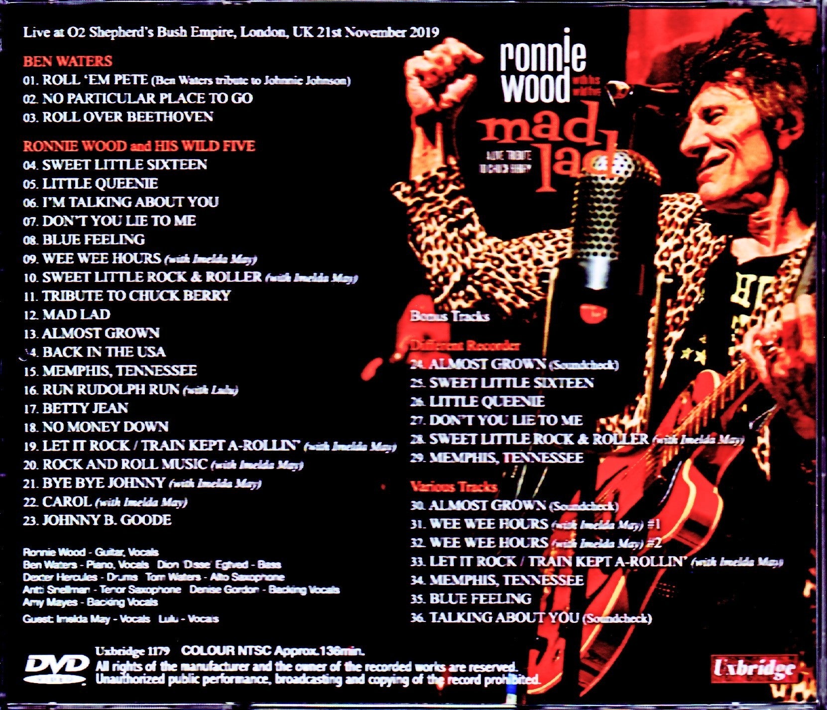Ronnie, who released the live album "MAD LAD" from the Chuck Berry tribute concert held last year, is performing several gigs this November. Among them, Shepherd's Bush Empire attracted attention as it was widely announced even before the album was released. This venue is familiar to Stones gigs, and Ronnie has held his own gigs many times since the beginning of the 21st century, so it is a place he can call home. The gig that just took place on the 21st of last month was free for video shooting (I think Japan is the only place where it's still regulated...bitter smile), so audience videos have already appeared on YouTube, and among them is the entire show. This title is the DVD version of the stunning version that captures this. The footage, which seems to have been shot from the balcony directly in front of the stage, is extremely stable, and the quality is so great that you can watch the 90-minute gig all the way to the end without getting tired. On the contrary, as a result of the VIP ticket slot being set up for the gig at Shepherd's Bush, a video of some of the soundcheck was even circulated. Therefore, this time we have thoroughly summarized the gig videos at Shepherd's Bush that have appeared on YouTube. The main feature is an almost complete recording of the gig taken on the balcony. However, in this video, there were some skipped frames at the beginning and end of the show, but by patching in footage from a different angle from the same day, we were able to adjust it so that it could be seen smoothly without any interruptions. I'm doing it. In addition to the main video, a bonus video is recorded from the center of the first floor seats. Naturally, this shooting position is closer to the stage than balcony shooting, and the appeal is that it gives you the sense of being there as if you were watching the live performance. For each song, the shooting button is pressed after the performance begins, and although it is a shame that the intro and early part (and even the ending) are somewhat cut-off, the powerful angles more than make up for it. The last thing recorded was another video that was compiled over 13 minutes, and as you can imagine from its length, it is a shame that the performance is broken into pieces. However, among them, the video taken from the left side of the stage is attractive because it has a powerful close-up angle and the sound of Ronnie's guitar is captured greatly. Also, these two types of bonus footage are valuable because they both capture the sound check. For this gig, a band centered around Ben Waters, who is a pianist and previously participated in Charlie Watts' The ABC&D Of Boogie Woogie band, will be backing, just like on the live album. By the way, Ronnie is the only guitarist, so the appeal is that you can enjoy his guitar throughout the entire album. Ronnie always tends to complement Chuck Berry's Keith when he is with the Stones, but he is always playing with him, and Ronnie's play of Berry is also attractive. What is surprising is that Ronnie runs around the stage full of energy throughout the gig, and even though he is the youngest member of the Stones, his footwork is so light that you can't believe he is 72 years old. Imelda May is participating as a guest vocalist there, and as a female vocalist with a rockabilly orientation, her compatibility with Berry's repertoire is excellent. "Sweet Little Rock & Roller", which Ronnie sang in the New Barbarians, is also the lead vocalist here. However, the biggest surprise was Lulu's appearance in the Christmas song "Run Rudolph Run." She is one year younger than Ronnie and is completely the same generation as her, active in the 1960s. Therefore, I am sorry to say that he will be 71 years old this year, but I am amazed not only by his light footwork, but also by his unwavering and powerful shout. With their participation, Ronnie's latest Chuck Berry tribute gig has a different charm than the live album. The concept of this gig is that "Don't You Lie to Me" and "Bye Bye Johnny" are played more faithfully to Berry's version than the Stones' version. After all, all of the videos are worth watching even though they are shot from the audience seats, so please enjoy them carefully until the bonus part. Live at O2 Shepherd's Bush Empire, London, UK 21st November 2019 AMAZING SHOT!! (135:51) BEN WATERS 1. Roll 'Em Pete (Ben Waters tribute to Johnnie Johnson) 2. No Particular Place to Go 3. Roll Over Beethoven RONNIE WOOD AND HIS WILD FIVE 4. Sweet Little Sixteen 5. Little Queenie 6. I'm Talking About You 7. Don't You Lie to Me 8. Blue Feeling 9. Wee Wee Hours (with Imelda May) 10. Sweet Little Rock & Roller (with Imelda May) 11. Tribute to Chuck Berry 12. Mad Lad 13. Almost Grown 14. Back In The USA 15. Memphis, Tennessee 16. Run Rudolph Run (with Lulu) 17. Betty Jean 18. No Money Down 19. Let It Rock/Train Kept A-Rollin' (with Imelda May) 20. Rock and Roll Music (with Imelda May) 21. Bye Bye Johnny (with Imelda May) 22. Carol (with Imelda May) 23. Johnny B. Goode Bonus Tracks Different Recorder 24. Almost Grown (Soundcheck) 25. Sweet Little Sixteen 26. Little Queenie 27. Don't You Lie to Me 28. Sweet Little Rock & Roller (with Imelda May) 29. Memphis, Tennessee Various Tracks 30. Almost Grown (Soundcheck) 31. Wee Wee Hours (with Imelda May) #1 32. Wee Wee Hours (with Imelda May) #2 33. Let It Rock/Train Kept A-Rollin' (with Imelda May) 34 Memphis, Tennessee 35. Blue Feeling 36. Talking About You (Soundcheck) Ronnie Wood - Guitar, Vocals Ben Waters - Piano, Vocals Dion 'Disse' Egtved - Bass Dexter Hercules - Drums Tom Waters - Alto Saxophone Antti Snellman - Tenor Saxophone Denise Gordon & Amy Mayes - Backing Vocals Imelda May - Vocals (guest) Lulu - Vocals (guest) COLOR NTSC Approx.136min.