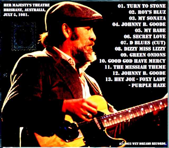 From the 1981 Australian tour, the show in Brisbane, Australia on July 5th was recorded almost in full on the soundboard from the local FM on-air master. First of all, the only recordings from that year were broadcast recordings from the North American tour in the fall, and the Australian tour itself is quite rare. The set started with "Turn to Stone", and included "Daisy Miss Lizzy", "Green Onion", and the final three Jimi Hendrix songs "Hey Joe", "Foxy Lady", and "Purple Haze". Most of the songs were covers, but even up to "Messiah Again", there was plenty of guitar playing that made full use of his signature picking harmonics technique, and the thick, metallic, and richly expressive guitar of the Telecaster. Live at Her Majesty's Theatre, Brisbane, Australia, July 5th 1981 : soundboard recording 01. Turn To Stone / 02. Roy's Bluz / 03. My Sonata / 04. Johnny B. Goode / 05. My Babe / 06. Secret Love / 07. D Blues (cut) / 08. Dizzy Miss Lizzy / 09. Green Onions / 10. Good God Have Mercy / 11. The Messiah Theme / 12. Johnny B. Goode / 13. Hey Joe - Foxy Lady - Purple Haze
