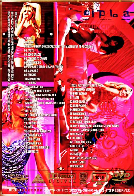 LIVE AT C&A 2025 [lollapalooza Chicago 2025]Grant Park:Chicago IL USA 03rd Aug 2025&[2025 Austin City Limits]Zilker Park:Austin TX USA 04th Oct 2025 NTSC Menu Chapter region02 01.Intro 02.Busy Woman (Noise caused by the master for 25 seconds) 03.Taste 04.Good Graces 05.Talking To Crowd 06.Slim Pickins 07.Manchild Spray Away Interlude 08.Manchild 09.Talking 10.Coincidence 11.Talking 12.Sharpest Tool 13.because i liked a boy 14.Let's Groove (w/EW&Fire) 15.September (w/EW&Fire) 16.Couple's Dance Contest Interlude 17.Nonsense 18.Feather 19.1-800-BED-CHEM Interlude 20.Bed Chem 21.Talking 22.Juno 23.Please Please Please 24.Crowd Walk 25.Don't Smile 26.Crowd Walk 27.Espresso Interlude 28.Espresso -[2025 Austin City Limits:TX]- 29.Intro(busy woman) 30.Busy Woman 31.Taste 32.Good Graces 33.slim pickins 34.manchild 35.coincidence 36.sharpest tool 37.because I liked a boy 38.don’t impress me much (w/ Shania Twain) 39.Couple's Dance Competition 40.nonsense 41.feather 42.1-800-BED-CHEM 43.bed chem 44.Juno 45.tears 46.please please please 47.don’t smile 48.espresso