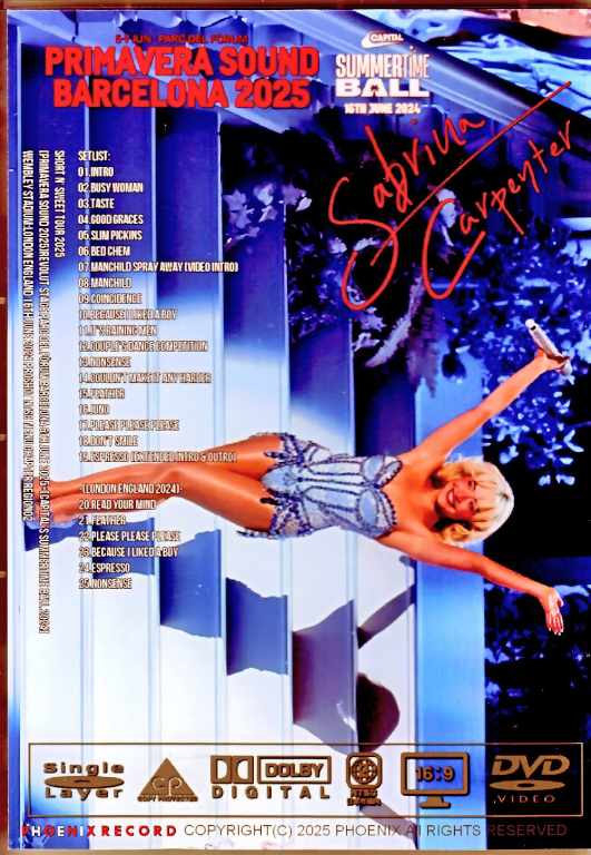 This DVD features a professional-quality recording of Sabrina Carpenter's performance at the Primavera Sound 2025 rock festival, held at the Revolut Stage Parc del Fòrum Barcelona on June 6, 2025. With the success of her sixth studio album, "Short n' Sweet," she made a global breakthrough in 2025, even headlining festivals around the world. This DVD features a unique and captivating performance, showcasing her sometimes cute and sometimes quirky side. The powerful and realistic live performance will leave you lost in time as you savored the incredible concert. The bonus track includes a professional recording of the performance at Capital's Summertime Ball 2024, the annual Capital-sponsored event held at Wembley Stadium in London in 2024. The video quality is consistent and high-quality, ensuring a truly enjoyable experience. Short n' Sweet Tour 2025 [Primavera Sound 2025]Revolut stage Parc del Fòrum Barcelona 6th June 2025+[Capital's Summertime Ball 2024] Wembley Stadium:London England 16th June 2024 Proshot NTSC Menu Chapter region02 01.Intro 02.Busy Woman 03.Taste 04.Good Graces 05.Slim Pickins 06.Bed Chem 07.Manchild Spray Away (Video intro) 08.Manchild 09.Coincidence 10.because i liked a boy 11.It's Raining Men 12.Couple's Dance Competition 13.Nonsense 14.Couldn't Make It Any Harder 15.Feather 16.Juno 17.Please Please Please 18.Don't Smile 19.Espresso (extended intro & outro) -(London England 2024)- 20.Read your Mind 21.Feather 22.Please Please Please 23.because i liked a boy 24.Espresso 25.Nonsense