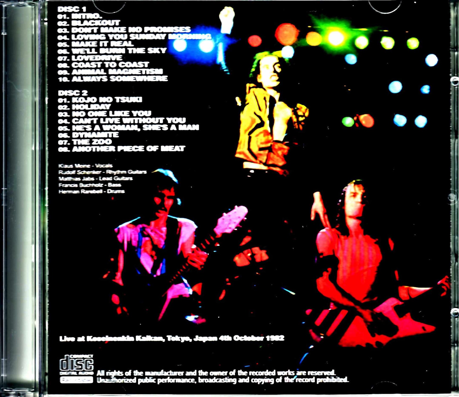 Disc 1 1. Intro. 2. Blackout 3. Don't Make No Promises 4. Loving You Sunday Morning 5. Make It Real 6. We'll Burn The Sky 7. Lovedrive 8. Coast To Coast 9. Animal Magnetism 10. Always Somewhere Disc 2 1. Kojo No Tsuki 2. Holiday 3. No One Like You 4. Can't Live Without You 5. He's A Woman, She's A Man 6. Dynamite 7. The Zoo 8. Another Piece Of Meat Klaus Meine - Vocals Rudolf Schenker - Rhythm Guitars Matthias Jabs - Lead Guitars Francis Buchholz - Bass Herman Rarebell - Drums