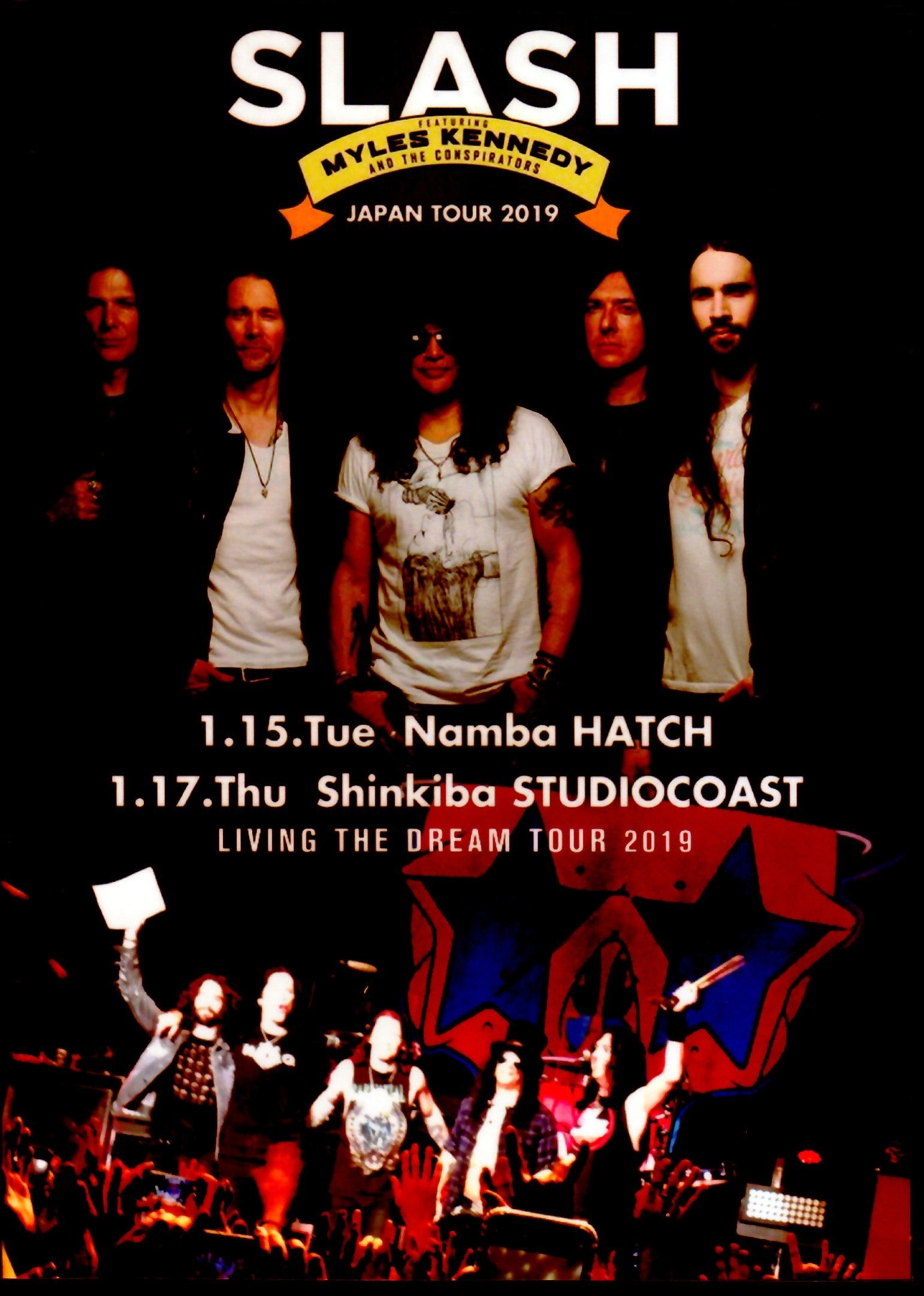 This is a video recording of the Japan tour of Slash featuring Myles Kennedy & The Conspirators, who came to Japan as part of their world tour "Living The Dream Tour." The tour was held in Osaka on January 15th and in Tokyo on January 17th, and the setlist consisted mainly of songs from the new album. There are 11 songs from the Osaka performance and 22 songs from the Tokyo performance. It includes videos with multiple audience shots and songs with short recording times. *Namba Hatch, Osaka, Japan January 15 2018 01.My Antidote/02.We're All Gonna Die/03.Doctor Alibi/04.Mind Your Manners/05.Driving Rain/06.Wicked Stone/07.Nightrain/ 08 .Starlight/09.World On Fire/10.Shadow Life/11.Anastasia *STUDIO COAST, Tokyo, Japan January 17 2018 01.The Call Of The Wild/02.Halo/03.Standing In The Sun/04.Back From Cali/05.My Antidote/06.Serve You Right/ 07.Read Between The Lines/08.Fall To Pieces/09.We're All Gonna Die/10.Doctor Alibi/11.Too Far Gone/12.Mind Your Manners/ 13.Driving Rain/14.Wicked Stone/15.Nightrain/16.The Great Pretender/17.By The Sword/18.Starlight/19.You're A Lie/ 20.World On Fire/21.Shadow Life /22.Anastasia (150 minutes)