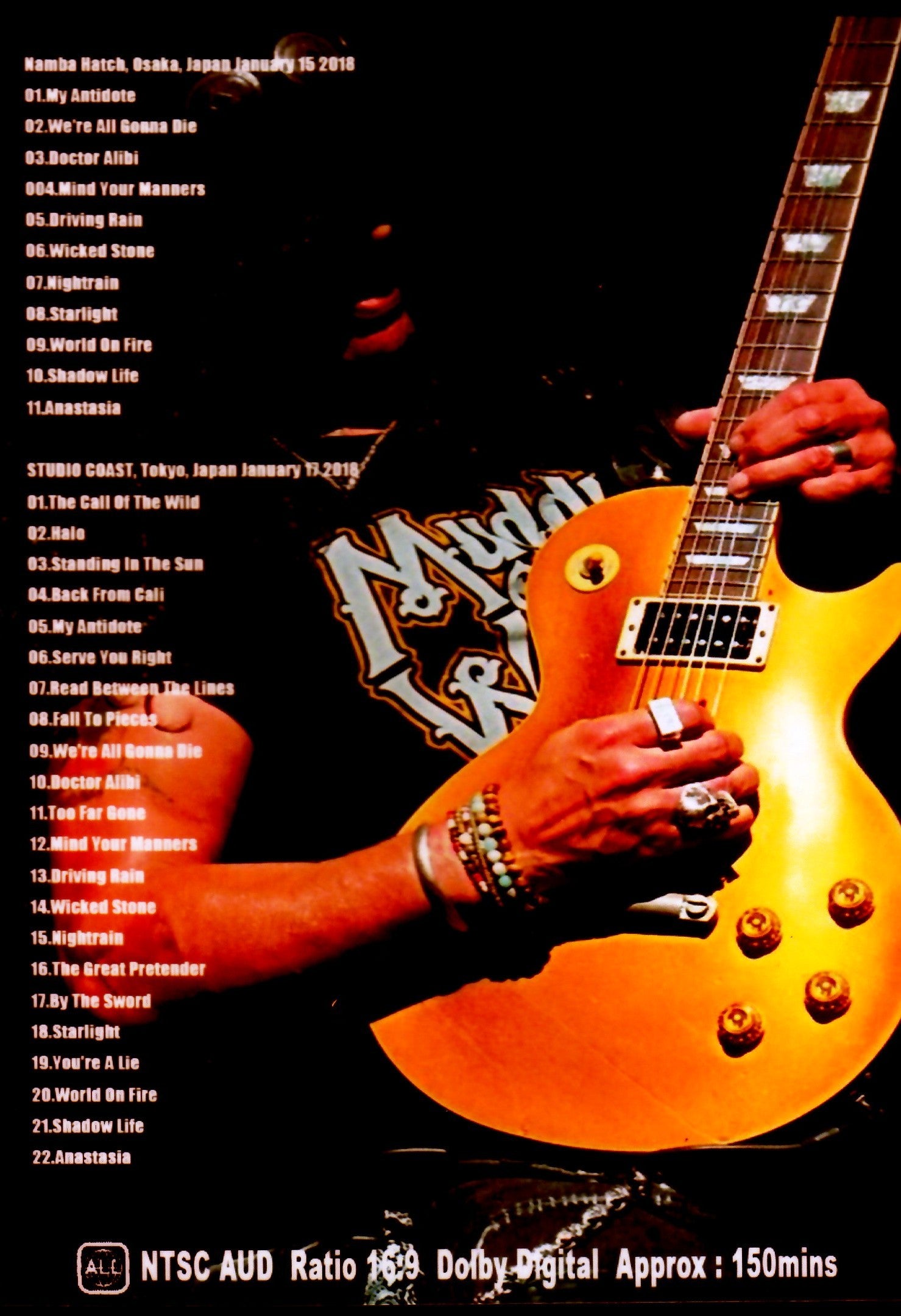 *Namba Hatch, Osaka, Japan January 15 2018 01.My Antidote/02.We're All Gonna Die/03.Doctor Alibi/04.Mind Your Manners/05.Driving Rain/06.Wicked Stone/07.Nightrain/ 08 .Starlight/09.World On Fire/10.Shadow Life/11.Anastasia *STUDIO COAST, Tokyo, Japan January 17 2018 01.The Call Of The Wild/02.Halo/03.Standing In The Sun/04.Back From Cali/05.My Antidote/06.Serve You Right/ 07.Read Between The Lines/08.Fall To Pieces/09.We're All Gonna Die/10.Doctor Alibi/11.Too Far Gone/12.Mind Your Manners/ 13.Driving Rain/14.Wicked Stone/15.Nightrain/16.The Great Pretender/17.By The Sword/18.Starlight/19.You're A Lie/ 20.World On Fire/21.Shadow Life /22.Anastasia (150 minutes)