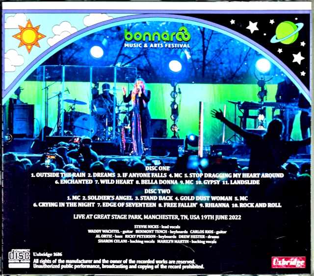 As many big name artists resume their live performances, Stevie Nicks also embarked on a solo tour ahead of Fleetwood Mac. Her live performances began in May and included an appearance at the well-known Bonnaroo Festival in June. This was the first time the festival was held due to the COVID-19 pandemic, and it was naturally canceled in 2020. It was originally supposed to be held in September of last year, but unfortunately it was canceled due to flooding from a hurricane. This was the first festival held during the COVID-19 pandemic. Speaking of her live recordings, the 1989 superb recording "COSTA MESA 1989: MIKE MILLARD MASTER TAPES" by Mike Millard is still fresh in our memory, and just like that, the opening begins with the classic pattern of "Outside the Rain" followed by "Dreams", and the backing band's performance is also faithful to the original arrangement, so it's a pleasant surprise for fans who are looking for a live performance in the 1980s, when she was at the peak of her solo career. What's more, her singing voice, which has not weakened at all, is in no way inferior to her peak, so it's nothing short of amazing. In addition, this tour continues the Tom Petty memorial mode that was glimpsed on the stage from 2018 to 2019, which was the last tour as Fleetwood Mac so far, and the first encore song is his "Free Fallin'", which was sung at that time. Moreover, she has further promoted the Petty memorial mode, which is unique to her solo stage, which is different from Mac's, by arranging "Stop Dragging My Heart Around," which is an indispensable song when it comes to Petty and Nicks. On top of that, she has a confident set list that lists all the representative songs of her solo career. She even revives the familiar pattern of ending with ZEP's "Rock and Roll." And since the audience recording this time was recorded using an iPhone app, the sound spread is not that great. Nevertheless, her singing voice and the backing performance are captured surprisingly close, and it is a unique listening experience that is very solid and has an analog-like feel. This also matches well with the band sound of this stage. Since the sound does not spread, the sound quality is solid, so it is more enjoyable when played on speakers, but in addition to that, the staging is just like the peak of her career, and this is also a good way to enjoy Stevie Nicks' latest stage, which has a full solo feel that you would never think of in 2022. Please enjoy her singing voice, which has not deteriorated at all. Bonnaroo Music and Arts Festival, Manchester, TN, USA 19th June 2022 PERFECT SOUND Disc 1 (39:38) 1. Outside the Rain 2. Dreams 3. If Anyone Falls 4. MC 5. Stop Dragging My Heart Around 6. Enchanted 7. Wild Heart 8. Bella Donna 9. MC 10. Gypsy 11. Landslide Disc 2 (55:41) 1. MC 2. Soldier's Angel 3. Stand Back 4. Gold Dust Woman 5. MC 6. Crying In the Night 7. Edge of Seventeen 8. Free Fallin' 9. Rhianna 10. Rock and Roll