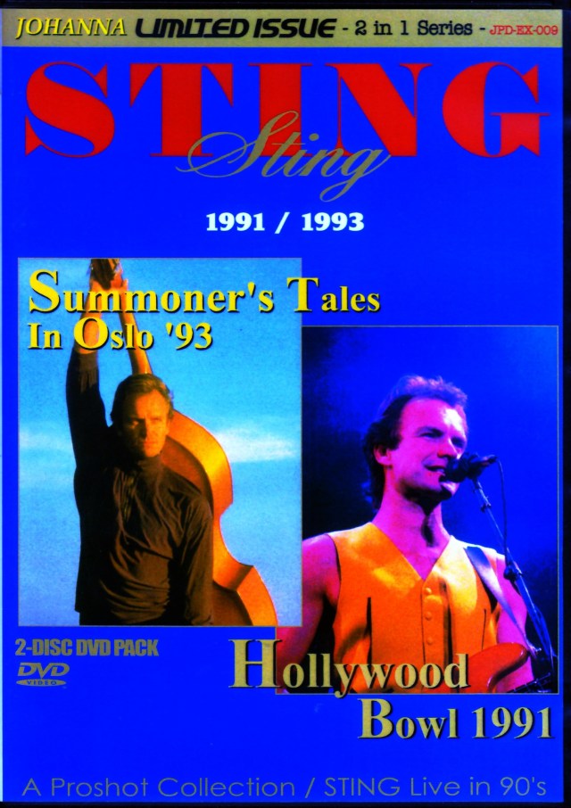This is a master quality coupling of professional shot live performances from the 1991 "Soul Cage" and 1993 "Ten Summoners Tales" periods after he turned solo. Disc 1 contains an 89-minute recording of a live performance at the Hollywood Bowl in Los Angeles on October 2, 1991. Starting with the numbers from "Soul Cage," the album also includes Police tunes from the middle onwards, and Andy Summers' participation in three Police numbers is also a must-see. By the way, this was also Sting's birthday live performance. Disc 2 also contains a 104-minute recording of the Othello performance in Norway on August 25, 1993, taken from the TV on-air master. This includes the numbers from "Ten Summoners Tales," as well as Police tunes, and the band also includes Vinnie Colaiuta and other great members for a tight performance. Disc 1 : ALL THIS TIME / (IF YOU LOVE SOMEBODY) SET THEM FREE / WE'LL BE TOGETHER / WALKING ON THE MOON / EVERY BREATH YOU TAKE / MESSAGE IN A BOTTLE / ROXANNE / JEREMIAH BLUES PART 1 / BAND INTRODUCTION / WHY SHOULD I CRY FOR YOU / BE STILL MY BEATING HEART / KING OF PAIN / FORTRESS AROUND YOUR HEART / THE WILD WILD SEA / THE SOUL CAGE / BRING ON THE NIGHT / FRAGILE [Live at Hollywood Bowl, Los Angeles, CA, USA October 2nd 1991] Disc 2 : 01. If I Ever Lose My Faith In You 02. Heavy Cloud No Rain 03. Love Is Stronger Than Justice 04. Seven Days 05. Fields Of Gold 06. Synchronicity II 07. Every Little Thing She Does Is Magic 08. Roxanne 09. It's Probably Me/ Sister Moon 10. Shape Of My Heart 11. Saint Augustine In Hell/ Straight To Heart 12. Englishman In New York 13. King Of Pain/ All This Time 14. Bring On The Night/ When The World Is Running Down 15. She's Too Good For Me 16. Nothing 'Bout Me 17. Every Breath You Take 18. Fragile [Live at Oslo, Spektrum, Oslo, Norway August 28th 1993]