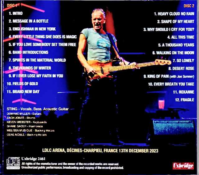 LDLC Arena, Decines-Charpieu, France 13th December 2023 IEM(from Original Masters) Disc:1 (46:45) 1. Intro 2. Message in a Bottle 3. Englishman in New York 4. Every Little Thing She Does Is Magic 5. If You Love Somebody Set Them Free 6. Band Introductions 7. Spirits in the Material World 8. The Hounds of Winter 9. If I Ever Lose My Faith in You 10. Fields of Gold 11. Brand New Day Disc:2 (60:33) 1. Heavy Cloud No Rain 2. Shape of My Heart 3. Why Should I Cry for You? 4. All This Time 5. A Thousand Years 6. Walking on the Moon 7. So Lonely 8. Desert Rose 9. King of Pain (with Joe Sumner) 10. Every Breath You Take 11. Roxanne 12. Fragile Sting : vocal, bass Dominic Miller : guitar Zach Jones : batterie, percussions Kevon Webster : claviers, choeurs Shane Sager : harmonica Melissa Monique & Gene Noble : vocal